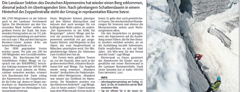 Die Geschäftssstelle des DAV Landau ist umgezogen! Seit 1. Mai 2014 finden Sie unser Büro im Jeanne d’Arc Business Center (Nähe Media Markt) Alfred-Nobel-Platz 1, 76829 Landau Tel.: 06341 – 28 33 57 Die neue Faxnummer der Geschäftsstelle lautet: 06341 / 55 750 77 Die Öffnungszeiten sind wie gewohnt dienstags von 16.00 – 19.00 Uhr.