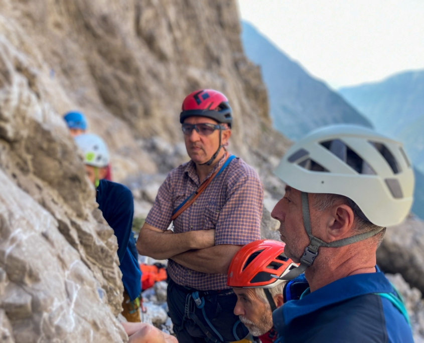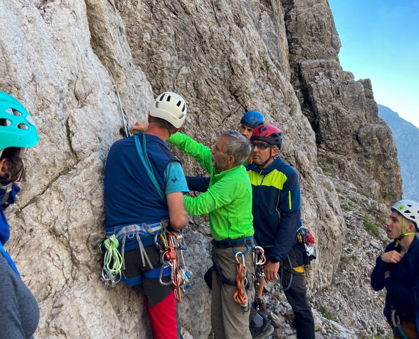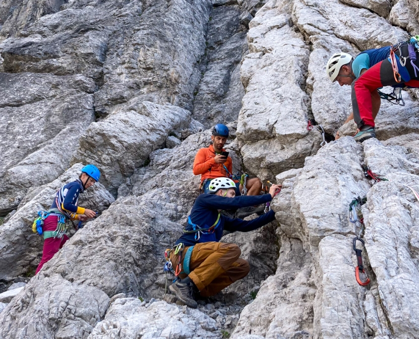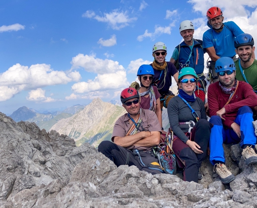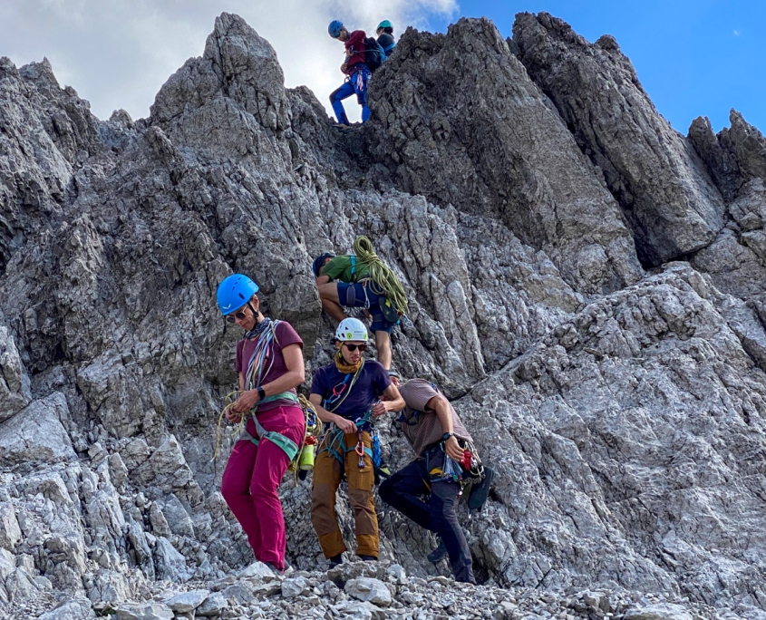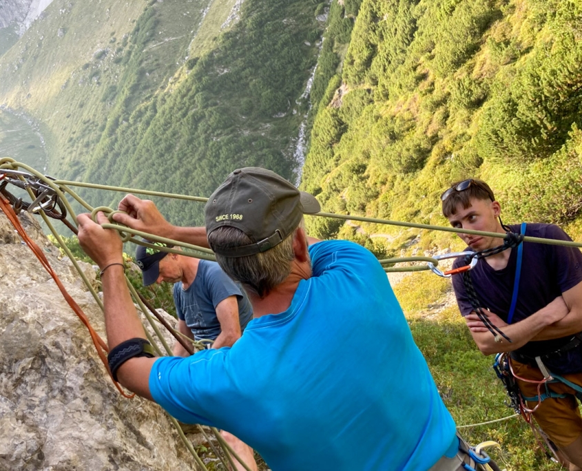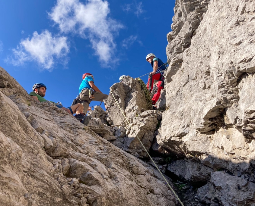Jawoll, Frühstück um 7:00 Uhr, Abmarsch eine Stunde später. Man kann dabei auf dem Weg bleiben, oder aber eine Schuttreise hoch, lt. Werner um den Anspruch etwas zu erhöhen und was zu lernen. Nach dem Motto, viele Wege führen nach Rom, kamen wir selbstverständlich am Einstieg der Tour(en) an. Richtig, wir hatten zwei, die Südostkante (4+), überwiegend nur Standplätze und ein paar Haken. In die stiegen Werner und Harald in 2er Seilschaft sowie Brigitte, Stefan und Moritz. In der Südwand (5-) waren Daniel, Peter und ich unterwegs, plaisirmäßig abgesichert. Alle konnten das Erlernte umfassend und erfolgreich zum Einsatz bringen. Die Seilschaften in der Südostkante erreichten den Gipfel mit nur minimalem Vorsprung als erstes, wir hatten aber nur wenige Minuten Verzögerung. Nach einer kurzen Pause wurden alle Seile aufgenommen und als Seilpuppe auf dem Rücken befestigt. Dann ging es den Abstieg. Zuerst etwas abklettern, dann normal absteigen, wobei der letzte Abschnitt fast durchgehend mit Stahlseilen gesichert war.