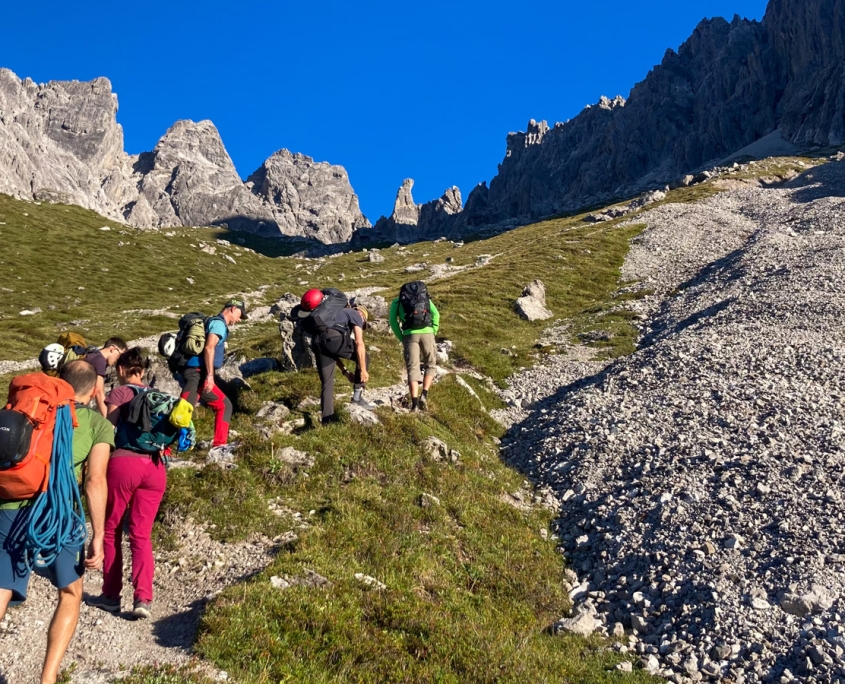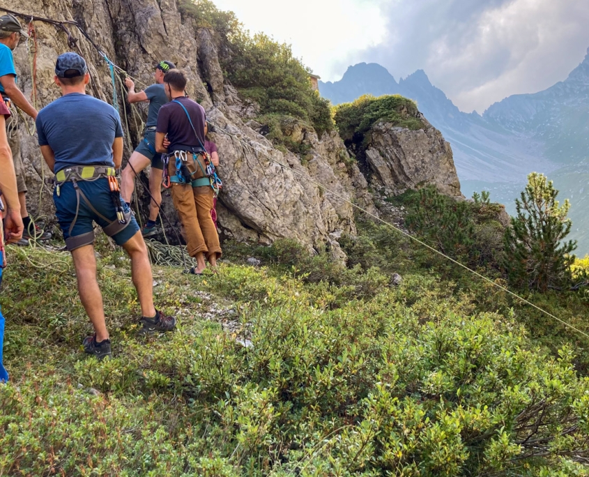 Für den Rückweg nahmen wir dieses Mal den offiziellen Weg und erreichten rechtzeitig die Hütte zur Kaffeezeit. Bevor wir aber zum Abendessen gingen, gab es noch eine abschließende Lehreinheit an einem nahegelegenen Felsen zum Thema Unterstützen eines Nachsteigers mit Flaschenzug und mit Körperhub. Nachdem Werner und Harald es vorgestellt hatten, konnte jeder das Ganze üben. Der Abend verlief entspannt und fröhlich.