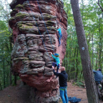 Am Fuß unserer Tour gab es erst mal eine Einweisung in das Legen von mobilen Sicherungen. Friends, Keile, Köpfelschlingen und sogar eine Knotensicherung so wie man es aus der sächsischen Schweiz kennt, standen auf dem Programm. Zur Wiederholung des Vortages durften wir in 2er Gruppen Standplätze mit mobiler Sicherung aufbauen, mit Abspannen nach unten, so dass bei einem eventuellen Sturz eines Vorsteigers alle Sicherungen dort bleiben, wo sie sollen. Nachdem wir uns ausgiebig damit beschäftigt haben, jeder sich noch einmal gestärkt hat und die Mittagssonne mittlerweile ihre volle Hitze entwickelte, ging es in die Tour. Und nicht zu vergessen sei, dass wir ja um 16:00 Uhr zurück sein wollten, um die besagten Käsespätzle, den Kaiserschmarrn und natürlich Kaffee und Kuchen zu bekommen. Werner begleitete das erste Dreiergespann, Harald das zweite. Am Standplatz ankommen, hieß es also Standplatz aufbauen, selbst sichern, die Nachkommenden sichern und in einen Tube aufnehmen. beide Nachsteiger nachsteigen lassen, jeden am Standplatz sichern und dann gleich den Seilsalat aufräumen, damit der Nächste weiter vorsteigen konnte. So hangelten wir uns die vier Seillängen empor. Ungefähr gegen 15:00 Uhr kam die erste Seilschaft oben an, also noch früh genug, um das mit Kuchen und Co. hin zu bekommen. Doch wie das im alpinen Gelände wohl so ist, war die Wegfindung und das Finden der Abseilroute gar nicht so einfach. Werner machte den Anfang und seilte sich ins Ungewisse ab, denn der eigentliche Abseilpunkt war zuerst nicht aufzufinden. Doch Werner fand ihn nach längerem Suchen, seine Gruppe seilte sich danach ab. Als das Seil abgezogen war, folgte Harald. Leider sorgte der mittlerweile aufgekommene starke Seitenwind dafür, dass die geworfenen Seile ein Eigenleben entwickelten, quer zum Fels um mehrere Ecken wehten, um sich dort selbst zu fixieren. Das bedeutete, abseilen, am Fels entlang quer den Seilen folgen, gesichert absteigen, Seile lösen, wieder aufsteigen, zurück zur ursprünglichen Route, dort noch eine Expressschlinge mitnehmen, die Werner beim nochmals hochklettern dort gelassen hatte. Sein Seil hatte sich nämlich beim Abziehen verheddert. Aber es kamen alle sicher am Fuß der Wand an, nur leider viel später als erwartet. Ade Kaffee und Kuchen, wir mussten sogar anrufen, dass wir später zum Abendessen kommen.