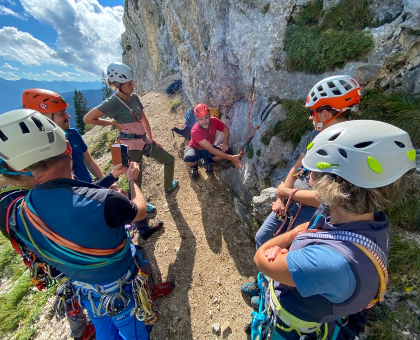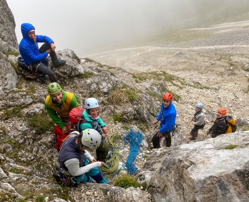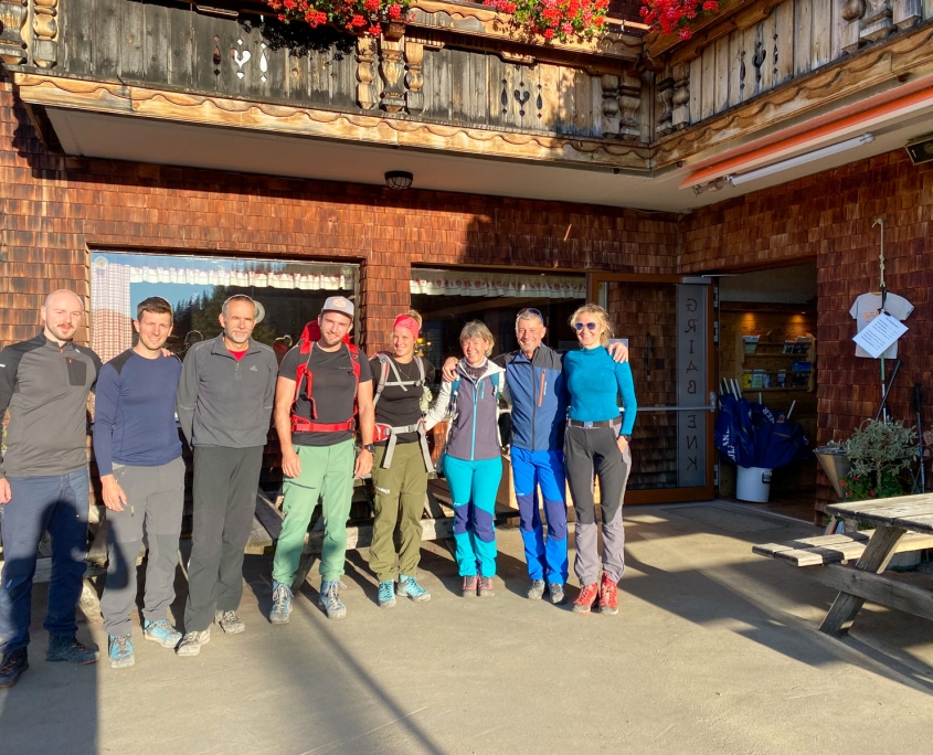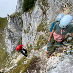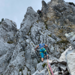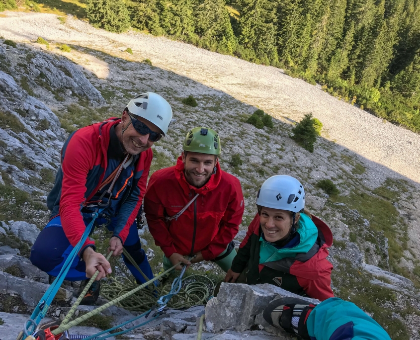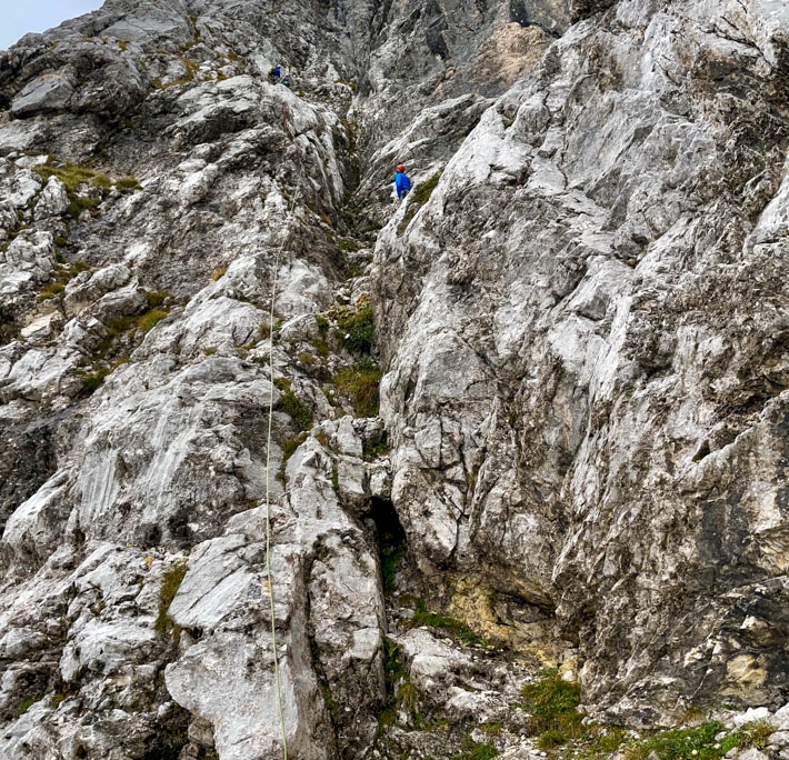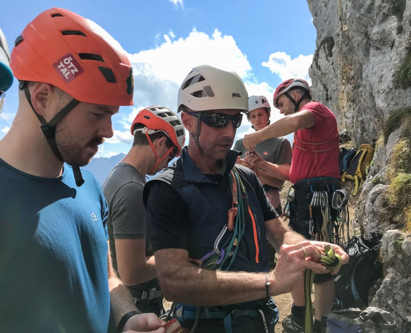 Dieses Mal hatten wir drei Zweier-Seilschaften, Werner und ich verteilten uns jeweils in die erste und letzte Seilschaft. Der Blick nach oben am Einstieg der Gimpel Südostwand zeigte, dass noch nicht alles trocken war. Das würde ein Spaß werden. Aber es klappte tatsächlich besser als erwartet. Der ein oder andere „Verhauer“ sorgte dann mal kurz für eine Lehreinheit und einen stellenweise leicht erhöhten Adrenalinspiegel. Aber alle Seilschaften kamen gesund und munter, wenn auch etwas verspätet, am Ausstieg an. Beim anspruchsvollen Abstieg bot sich dadurch sogar noch die Gelegenheit den Teilnehmern die schnelle Ablassschaukel näher zu bringen. So kamen wir nur ein wenig zu spät zum Abendessen.