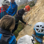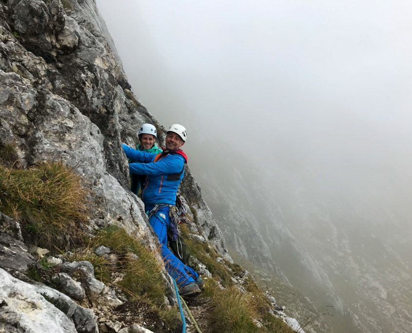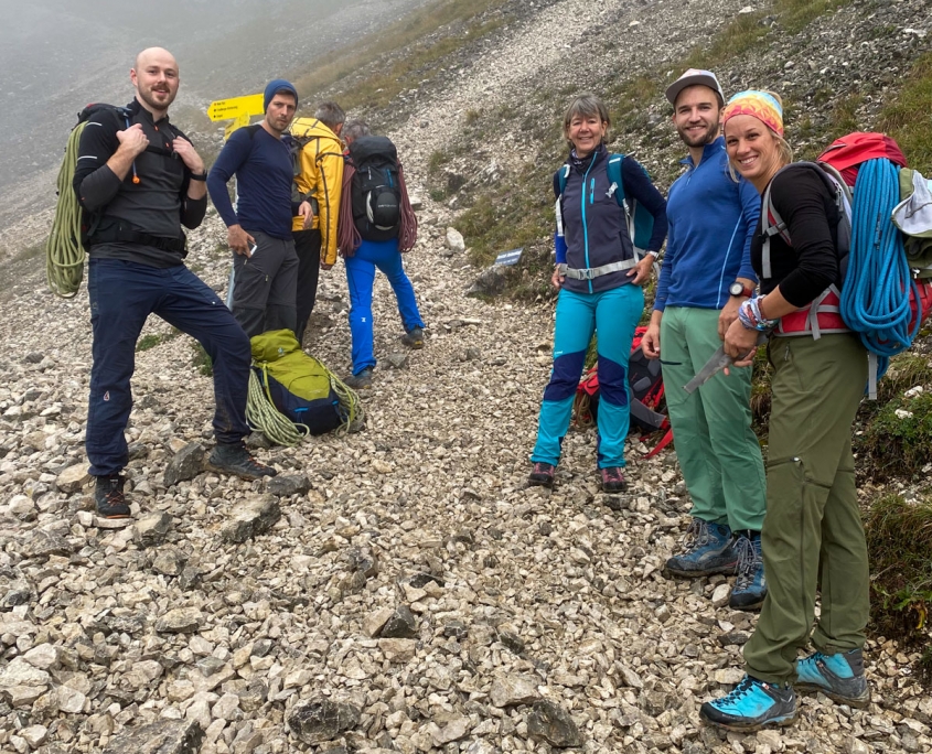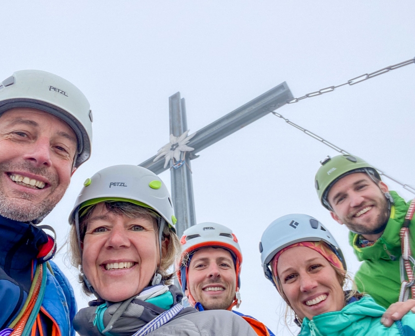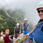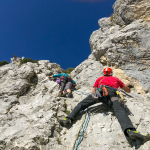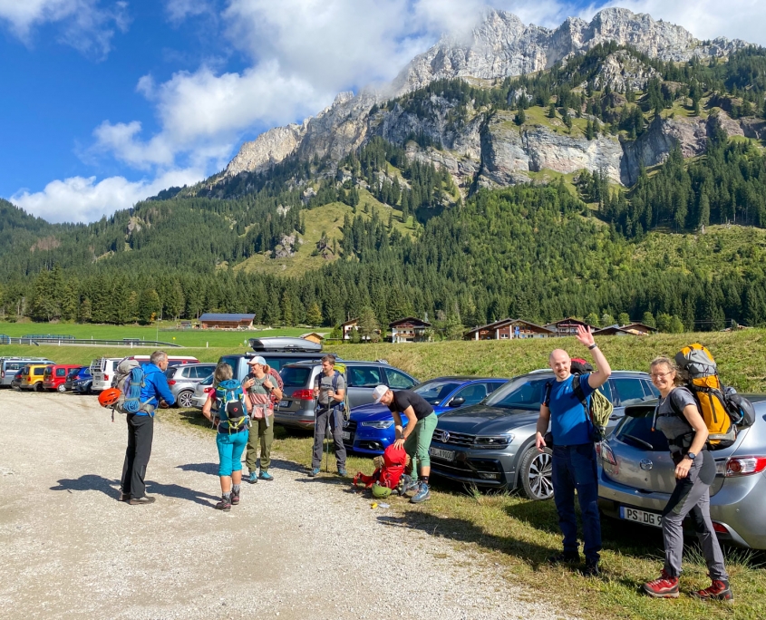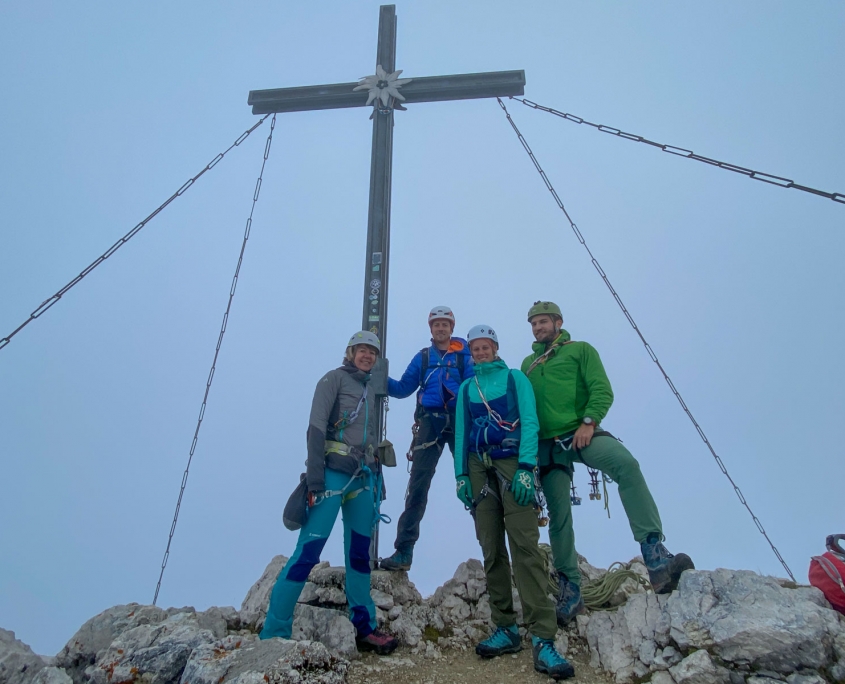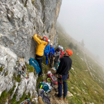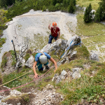 Dieses Mal hatten wir drei Zweier-Seilschaften, Werner und ich verteilten uns jeweils in die erste und letzte Seilschaft. Der Blick nach oben am Einstieg der Gimpel Südostwand zeigte, dass noch nicht alles trocken war. Das würde ein Spaß werden. Aber es klappte tatsächlich besser als erwartet. Der ein oder andere „Verhauer“ sorgte dann mal kurz für eine Lehreinheit und einen stellenweise leicht erhöhten Adrenalinspiegel. Aber alle Seilschaften kamen gesund und munter, wenn auch etwas verspätet, am Ausstieg an. Beim anspruchsvollen Abstieg bot sich dadurch sogar noch die Gelegenheit den Teilnehmern die schnelle Ablassschaukel näher zu bringen. So kamen wir nur ein wenig zu spät zum Abendessen.