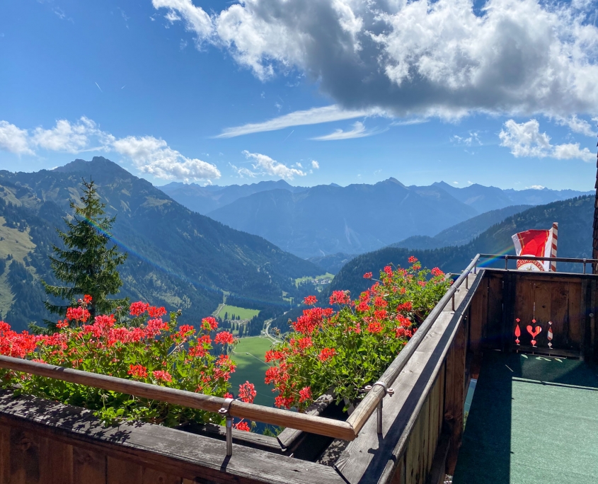 Einmal mehr hatten wir bestes Bergwetter, aber das sollte noch anders werden. Ein kurzweiliger nicht allzu langer Aufstieg brachte uns direkt auf die Terrasse des Gimpelhaus. Sonnenschein, da musste erst einmal eine Pause her.