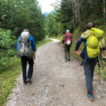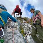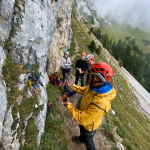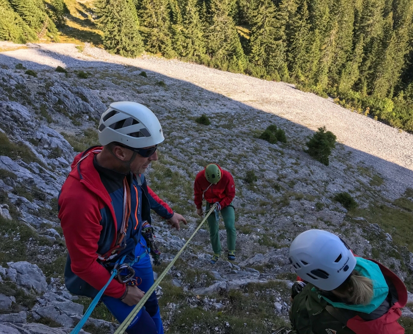 Das Wetter wurde wieder besser. Wir beschlossen beim Abstieg am Klettergarten unterhalb des Gimpelhaus einen Zwischenstopp einzulegen. Ein paar Inhalte wollten noch vermittelt werden. Wir zeigten und übten die Standplatz-Krake, aus dem Bereich der Bergrettung den Flaschenzug mittels Kurzprusik und wie man mit dem Körperhub auch schwerere oder verletzte Seilpartner zu sich an den Stand holen kann.