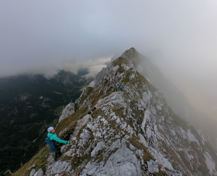 Nach dem Frühstück fanden wir uns, noch bei Sonne, wieder am Fuß des Hochwiesler ein. Der Hüttengrat stand auf dem Plan. Aber zuerst noch Input zum Sichern von Vor- und Nachsteiger, Kommandos beim Alpinklettern und Organisation am Stand. Und dann stiegen wir in zwei Dreier-Seilschaften in den Hüttengrat ein, Werner und ich immer mit Rücklaufsperre nach dem Vorsteiger um beim Standplatzbau bzw. Sichern zu unterstützen. Das war recht kurzweilig, irgendwann sah man zwischen den langsam dichter werdenden Wolken sogar die Hütte. Nachdem alle oben angekommen waren ging es ans Abseilen. Danach noch etwas Sichern mit mobilen Sicherungsmitteln.