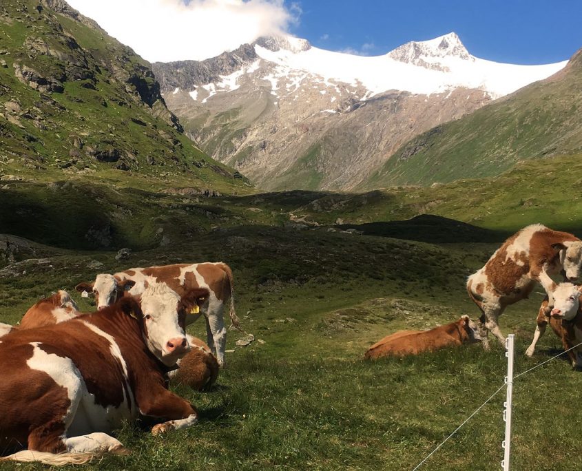 Donnerstag: Wir entschieden uns auf Grund der langen Rückfahrt an diesem Tag nur noch vom Defreggerhaus nach Hinterbichel von 2.962 hm auf 1.490 hm abzusteigen und auf den weiterhin geplanten Gipfel „Schwarze Wand“ zu verzichten. Bei schon wieder blauem Himmel können wir in der Ferne viele kleine schwarze Punkte als Karawane auf dem Weg zum Großvenediger ausmachen. Für uns geht es allerdings steil ins Tal hinab. Plötzlich sitzt direkt am Weg ein Murmeltier, was seelenruhig trinkt und sich selbst durch unser Fotoshooting nicht abschrecken lässt. Auf unserem weiteren Weg begleiten uns Schafe, in der Ferne Kühe und später eine ganze Gruppe von Murmeltieren, die erstaunlich nah und unerschrocken ist – und dann kurz vor der Johannishütte – ein Wiedersehen mit dem „running man“. Mit gutem Tempo erreichen wir schon um ca. 11:00 Uhr den Parkplatz in Hinterbichel. Wir beschließen vor der Rückfahrt gemeinsam im Ort zu essen. Gut gestärkt starten wir die Rückfahrt, die leider durch Baustellen, Staus, Unfälle und Gewitter geprägt waren, so dass wir trotz der frühen Abfahrt um kurz nach 12:00 Uhr mittags erst abends in Landau angekommen sind.