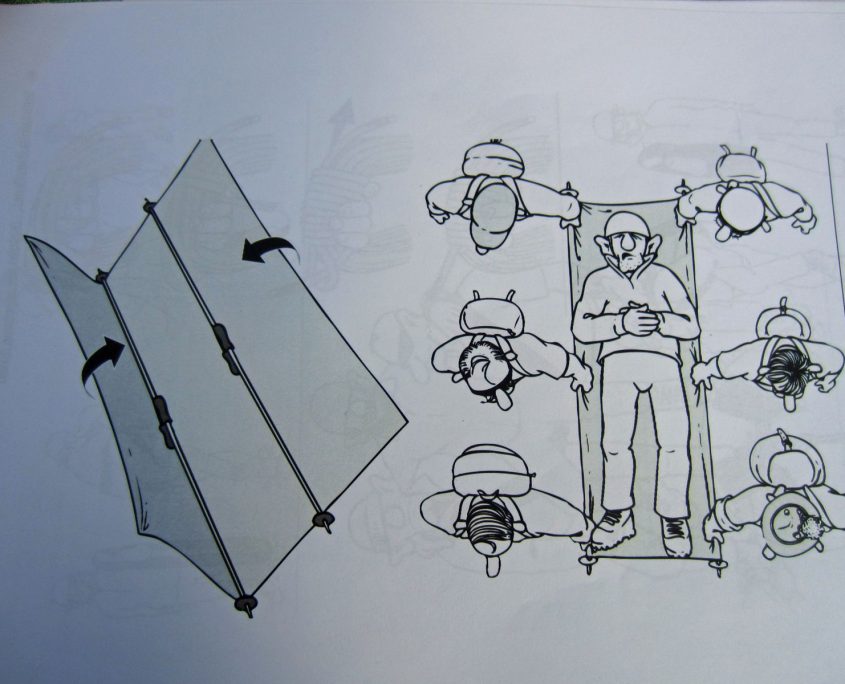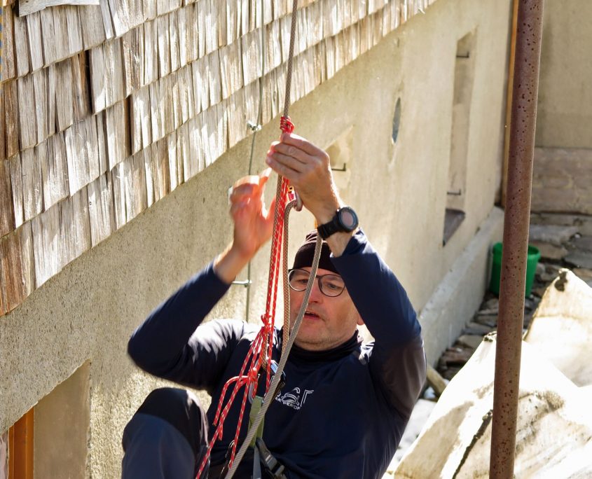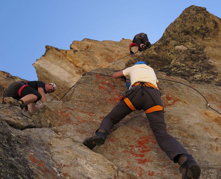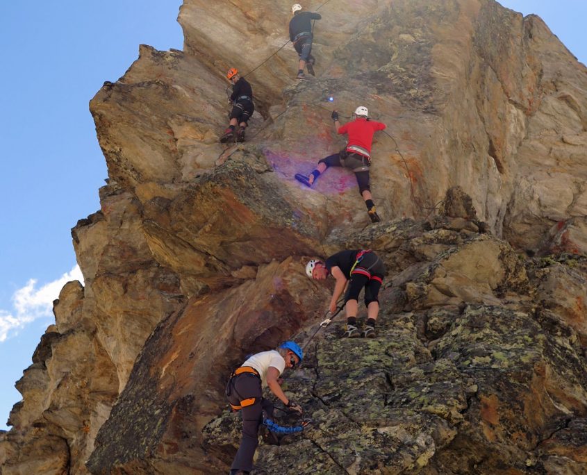 Am Montag, direkt nach dem Frühstück erfolgte die nächste Theorieeinheit: „Orientierung und Routenfindung“. Wir orientieren uns mit Bussole und Karte um einige Berge zu lokalisieren. Weiterhin planten wir eine Tour auf der Karte mit Höhenmetern, Entfernung, Leitzahlen und ermitteln letztendlich die benötigte Zeit inkl. Pausen. Nach einer kurzen Pause starten wir dann endlich zum Türmeljoch (2790 m), dem Einstieg zum Klettersteig „Türml“ (2845 hm) – ein kurzer aber dennoch sehr eindrucksvoller Klettersteig. Nach dem Rückweg zur Johannishütte standen bei uns Bergrettungs- und Erste-Hilfe-Kurs auf dem Programm. Bei den praktischen Übungen zum Thema Tragen- und Liegenbau mit Seilen und Biwak sack, sorgten wir für gute Unterhaltung aller Gäste, auf der Terrasse.
