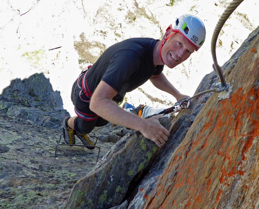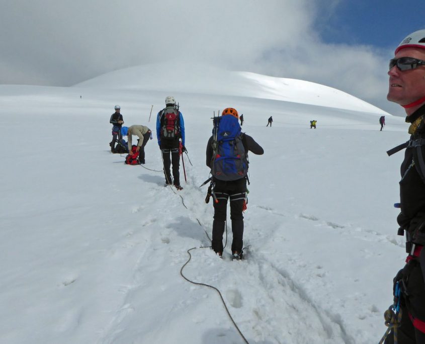 Mittwoch: Nach einer Nacht, die durch das lautstarke Packen der Nachbarn schon früh beendet ist und einem wohltuenden Frühstück, holen wir unsere unvollendete Spaltenbergung vom Vortag am Fahnenmast der Hütte nach. Aus diesem Grund sind wir so ziemlich die Letzten, die an diesem Morgen auf den Großvenediger starteten. Zuerst geht es ca. ½ Stunde steil über Steinplatten zum Gletschereinstieg. Dort fällt uns ein älterer Herr auf, der ohne Gletscherausrüstung (nur mit Wanderschuhen und Stöcken) alleine vor uns unterwegs ist. Wir laufen nun zu sechst in einer Seilschaft. An diesem Morgen ist es leider etwas nebelig, klart allerdings zwischendurch auf. Jetzt kommen uns schon die ersten entgegen, die bereits auf dem Rückweg sind. Der Weg über den matschigen Schnee zieht sich und da wir wieder im Nebel sind, ist kein Ziel in Sicht. Kurz vor dem Gipfel sehen wir kaum noch etwas – so auch nicht, wie tief der Berg vom Grad aus rechts und links nach unten abfällt. Endlich taucht kurz vor uns das Gipfelkreuz des Großvenedigers bei 3.662 hm auf. Trotz schlechter Sicht werden unzählige Gipfelbilder gemacht – Wie ein Geist tauchte dann wieder der ältere Mann auf, der uns dann Fotografierte. Auf dem Rückweg bleibt er erst längere Zeit zurück, um uns dann bei der Querung des Gletschers im vollen Laufschritt zu überholen. So nannten wir ihn dann „running man“. Auf dem Rückweg sind wir schneller als gedacht, so dass wir auf der Hütte noch Zeit für ein Mittagsschläfchen haben und anschließend unsere Selbstrettung mittels Prusik und Selbstflaschenzug an einem Geländer der Hütte üben konnten.