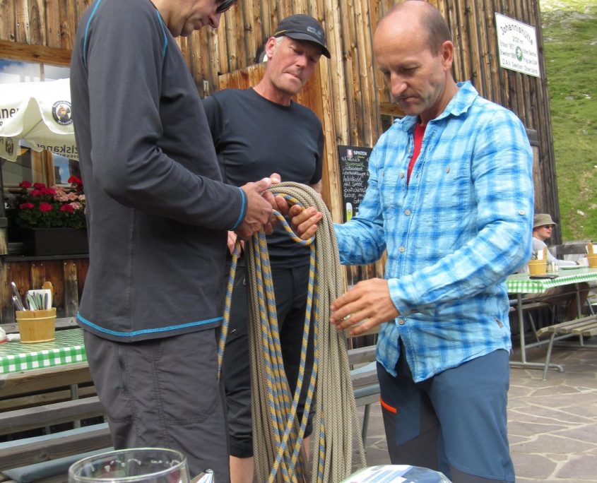 Am Sonntag den 16.07. treffen wir uns zu sechst um 6:15 Uhr am Parkplatz Queichheim zum Ausbildungslehrgang „Fels und Eis“ unter der Leitung von Joachim Reither und starten die Anfahrt nach Hinterbichel in der Bergregion Hohen Tauern. . Bei strahlendem Sonnenschein laufen wir dann auf einem Fahrweg, entlang saftiger Wiesen und eines rauschenden Bachlaufs, zur Johannishütte auf (hier hätten wir noch das Großvenediger-Taxi nehmen können). Kaum angekommen, ließen wir uns auch schon das erste Bier auf der schönen Terrasse schmecken. Die J.-Hütte ist komplett renoviert und es gibt tolle Hüttenschuhe in fast allen Größen. Für diesen Tag standen, nach einer kurzen Stärkung, eine Theorieeinheit zum Thema Seil- und Knotenkunde auf dem Programm. Stundenlang übten wir die verschiedensten Knoten.