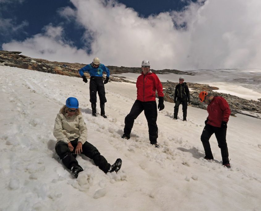 Sonnenschein zum Defreggerhaus auf 2.962 hm. (Zufällig gleiche Höhe wie unsere Zugspitze) Die Landschaft ist jetzt felsig, besteht hauptsächlich aus losen Steinplatten. Um 11:30 Uhr sitzen wir bereits bei unserem ersten Mittagessen. Nach Bezug der Zimmer geht es wieder los, um das Laufen auf dem Gletscher mit Schuhen und Steigeisen zu üben. Wir müssen lange üben, bis Joachim endlich mit uns zufrieden ist. Nun rutschen wir mal vorwärts, rückwärts, auf dem Bauch und auf dem Rücken auf dem Gletscher ab, um das Stoppen darauf zu üben und anschließend T-Anker und Eisschraube setzen zu erlernen. Nach Rückkehr und kurzer Pause in der Hütte starten wir erneut auf einen weiteren spaltendurchzogenen Gletscher, um die Spaltenbergung in der Praxis durchzuspielen. Jürgen, unser Opfer in der Spalte muss leider recht lange in der kalten Spalte auf seine Rettung warten. Da in der Nähe ein Gewitter aufzog, der Nebel näher rückt und es leicht anfängt zu graupeln, beenden wir unsere Aktion nach der ersten „Rettung“. Wir beschließen die Spaltenbergung vor Begehung des Großvenedigers am nächsten Morgen noch einmal an der Hütte zu wiederholen. Durch das lange Rumstehen auf dem Gletscher ist uns kalt geworden, so dass wir uns auf dem Rückweg beeilen in die Hütte zu kommen. Obwohl die Hütte keinen großen Komfort bietet und es nur Instantkaffee gibt, wird hier sogar bei Vegetariern darauf geachtet, dass sie nicht jeden Tag das gleiche essen müssen und auch der Nachtisch steigert sich anscheinend Tag für Tag. Für die Großen unter uns ist die Erkenntnis, dass das Bett auf dieser Hütte nur 1,90 lang ist und an beiden Enden eine hohe Kante hat, ziemlich frustrierend.