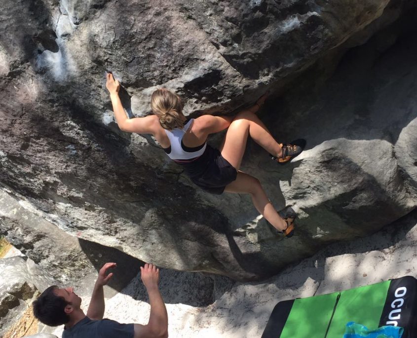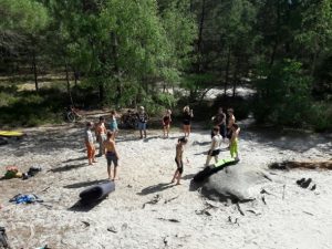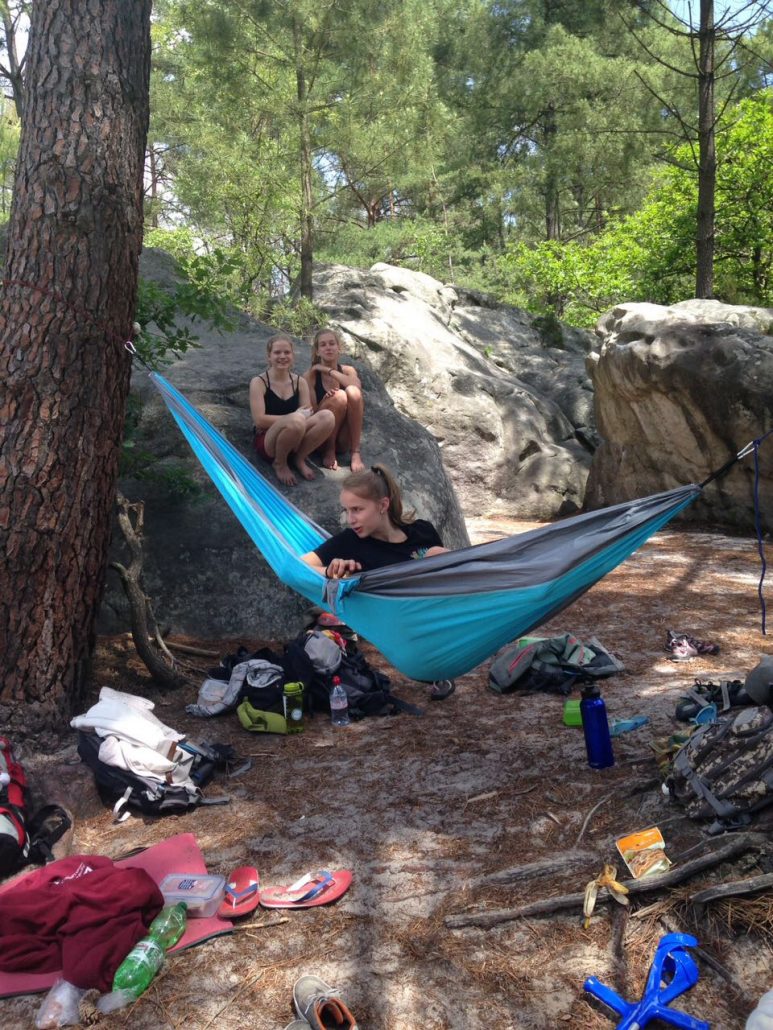 Sobald wir ein schattiges Plätzchen gefunden hatten, wurden die Hängematten aufgehängt und wir verteilten uns gleich in Gruppen und fingen an zu bouldern.