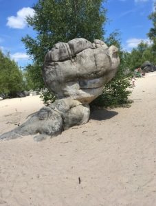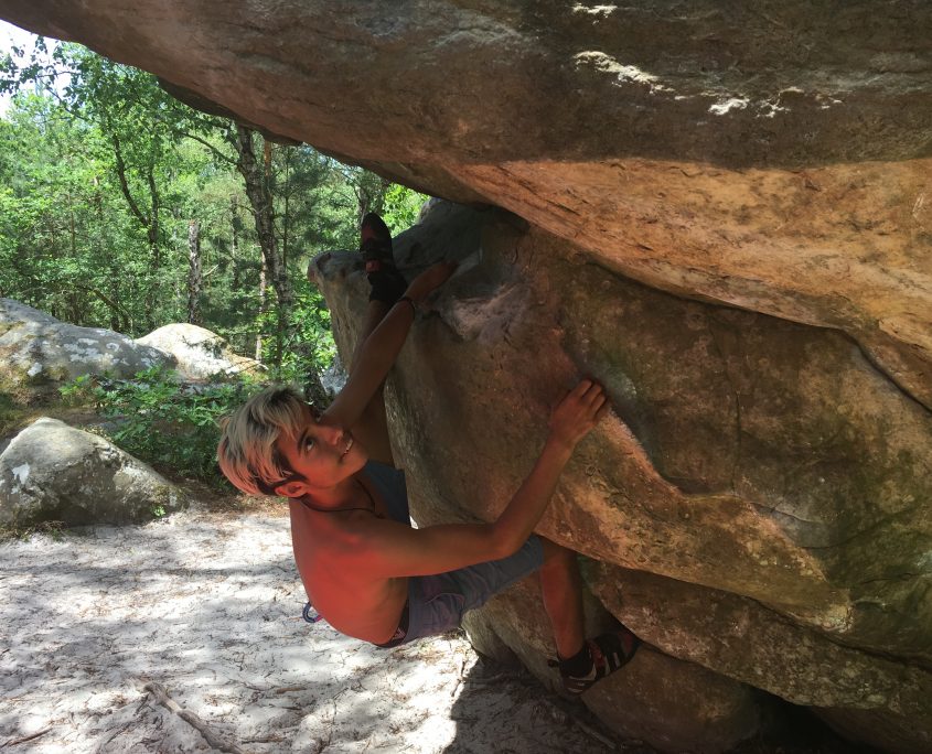 Dieses war wie das zweite im Hauptgebiet „trois pignons“ in der Nähe des „cul de chien“ („Snoopy“, ein berühmter Fels in Bleau). Er steht inmitten eines riesigen Sandstrandes, ein echtes Beachfeeling!