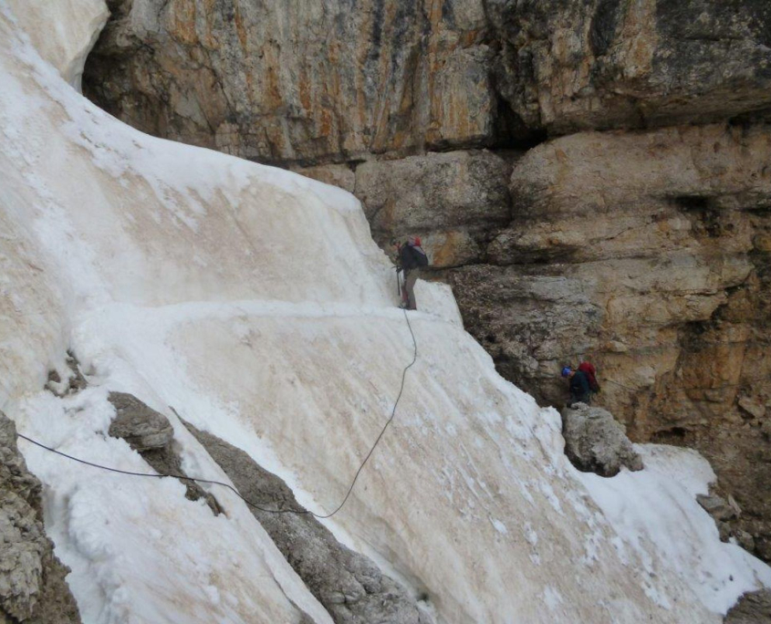 Am Donnerstag ging es über den Sosat-Klettersteig (max. 2.661m) zur Alimonta-Hütte (2.600 m). Beginnend mit einer Bergflanke (inklusive steilen Schneefeldern) ging es über den Punte di Campiglio zum eigentlichen, nagelneu bestens sanierten, Klettersteig, der traumhafte Bedingungen bei bestem Wetter bot.