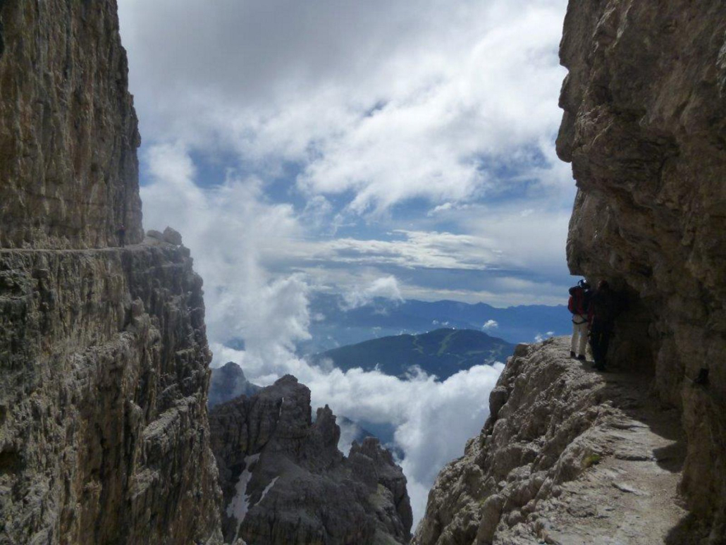 Am Donnerstag ging es über den Sosat-Klettersteig (max. 2.661m) zur Alimonta-Hütte (2.600 m). Beginnend mit einer Bergflanke (inklusive steilen Schneefeldern) ging es über den Punte di Campiglio zum eigentlichen, nagelneu bestens sanierten, Klettersteig, der traumhafte Bedingungen bei bestem Wetter bot.