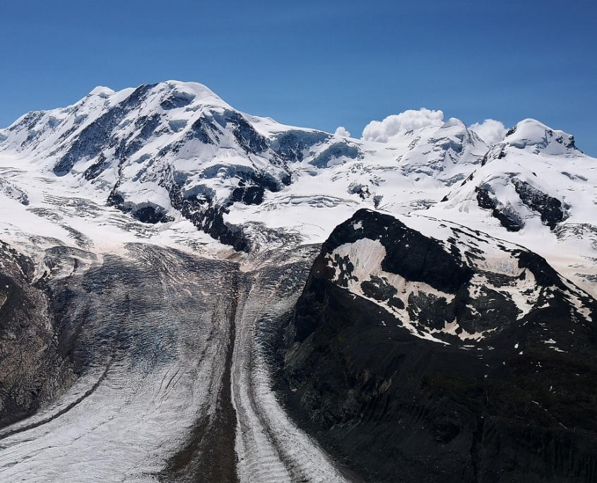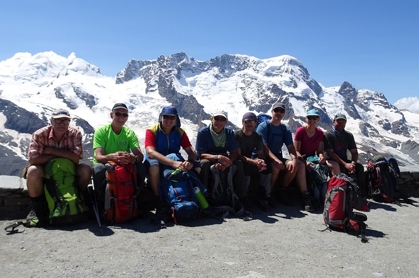 Am nächsten Morgen führte uns der direkte Weg zum vielbesuchten Gornergrat (3.105 m, www.gornergrat.ch). Die Sicht auf die umliegenden 29 4.000-er Berge gehört zu einem der Topausflugsziele nicht nur vom Wallis, sondern von der ganzen Schweiz. Bei umwerfender Sicht ließ uns diese Aussicht lange Zeit nicht los! Während ein Teil der Gruppe teilweise mit der Gornergratbahn, einer Zahnradbahn, ins Tal nach Zermatt fuhr, machte sich der Rest der Gruppe auf den Abstieg über die Riffelalp ins 1.616 m hoch gelegene Zermatt. ↑900 m, ↓1.248 m.