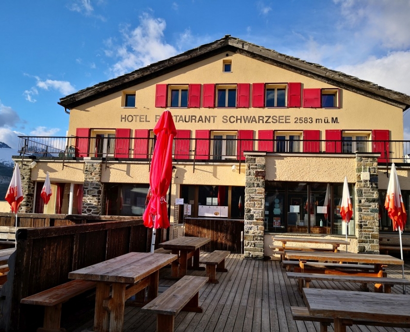 Während ein Teil der 8-köpfigen Gruppe die Schönbielhütte (2.694 m) in Angriff nahm, führte der Weg den Rest der Gruppe zum bekannten, direkt neben der Bergstation der Luftseilbahn am Schwarzsee liegenden Hotel „Schwarzsee“ (2.583 m, www.schwarzsee-zermatt.ch), insgesamt ohne Schönbielhütte ca. 13 km, ↑623 m, ↓600 m Abstieg). Zwei Mitwanderer hatten noch nicht genug und machten sich zum Aufstieg Richtung Hörnlihütte, dem Ausgangspunkt für die Bergsteiger die über den Hörnligrat das Matterhorn besteigen. Während tagsüber aufgrund der Seilbahn „mächtig Betrieb im Hotel Schwarzsee zu verspüren ist“, herrscht dort abends eine himmlische Ruhe und das bei wunderschönen Aussichten ins Tal nach Zermatt.