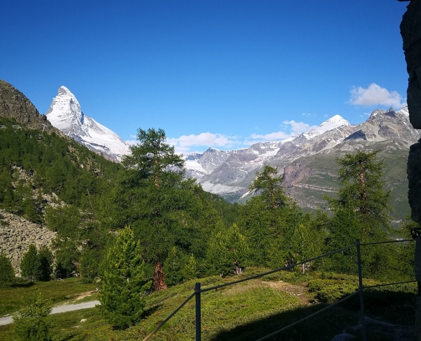 Nach einer kleinen Ortsbesichtigung begann unsere dreistündige Wandertour, vorbei an traditionellen ländlichen Holzschuppen mit dem Anstieg zum historischen „Berggasthaus Trift“ (2.337 m, 6 km, ↑900 Hm, ↓180 Hm Abstieg), auf dem Hinweg kehrten wir noch im exponiert liegenden Bergrestaurant Edelweiss (1.961 m, www.edelweiss-zermatt.com) ein.