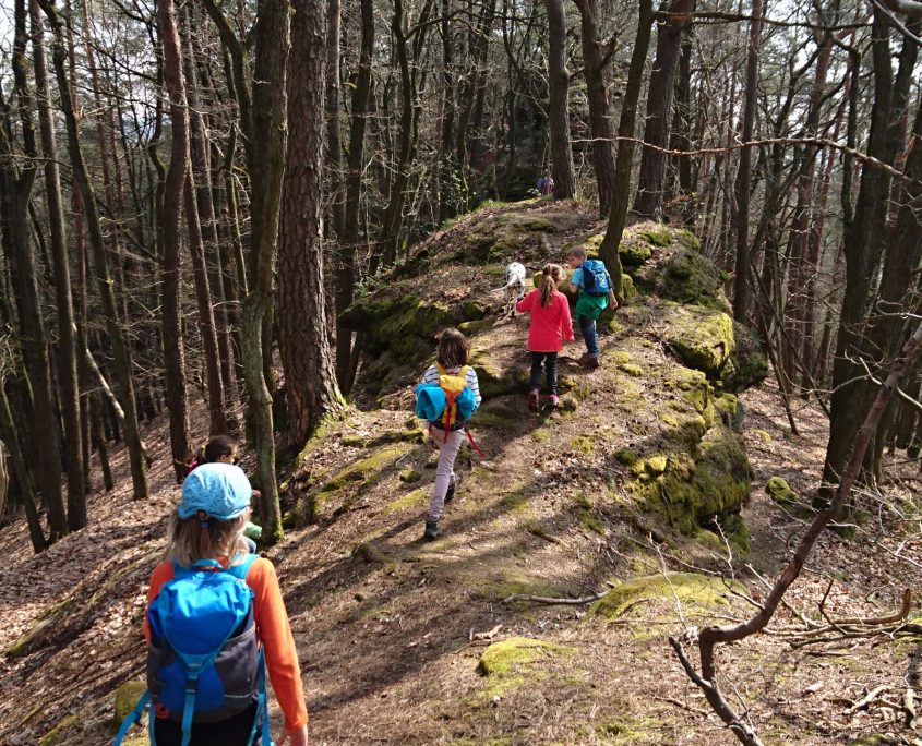 An diesem traumhaft sonnigen Morgen startete die Familiengruppe unter Leitung von Oliver Metz mitten im Pfälzer Wald. Oliver hatte angekündigt, dass es für die Kinder eine lange und anstrengende Tour werden soll. 12 km rund um Lug. Wir wanderten zu den Aussichtsfelsen rund um Lug, wobei die Höhepunkte der Kinder immer wieder die Felsen waren. Für manche Kleinere, für andere Größere. Schnaufend und prustend schafften sich die Kinder aber der Reihe nach auf die jeweils selbst gesteckten mehr oder weniger hohen Felsenziele.