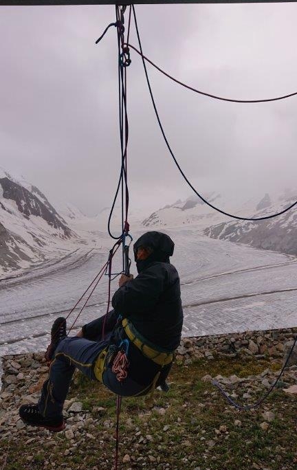 Der Übergang zur Konkordiahütte über die Grünhornlücke am darauffolgenden Tag begann gemütlich um 7 Uhr morgens bei leichtem Nieselregen, der allerdings im Laufe des Tages wieder aufhörte. Dieser Tag stand im Zeichen der Regeneration und der Spaltenbergung. Kurz vor dem Konkordiaplatz hatten wir die Möglichkeit auf einem Schneefeld die lose Rolle zu üben, bevor es über zahlreiche Stahltreppen zur Konkordiahütte hinauf ging. Auf der Hütte angekommen genossen einige Teilnehmer einen frisch gebrühten Kaffee aus einer kupferverzierten italienischen Espressomaschine und warteten einen kurzen Regenschauer ab. Danach ging es vor die Hütte um die Selbstrettung via Prusik und Gardaklemme zu üben, was jedoch in teilweise absurden Situationen endete. Dazu zählte, dass Maya diese Technik zum allerersten Mal anwendete und trotz Handicap, welches durch die Bauart der Hütte entstand, die Selbstrettung perfekt meisterte. Im Gegenzug dazu verwechselte der viel erfahrenere Klaus das Seil zum Hochprusiken mit dem Sicherungsseil und band sich falsch ein, während Sebastian durch eine abenteuerliche Konstruktion aus einem Tisch und größeren Steinen aus seiner Gardaklemme gerettet werden musste, die sich in seinen beiden Karabinern hoffnungslos verklemmt hatte.