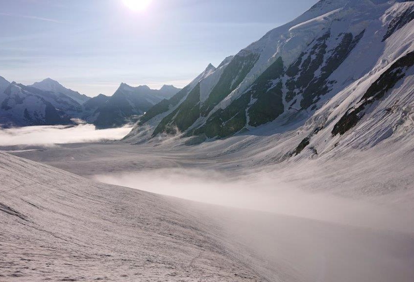 Am nächsten Morgen ging es in völliger Dunkelheit abermals um 4 Uhr morgens los. Unsere Gruppe, begleitet durch langsam aufsteigenden Nebel, der die Berge in ein weißes Gewand hüllte, überquerte den Konkordiaplatz und den Großen Aletschfirn um zur Hollandiahütte zu gelangen. An der Hütte angekommen machten wir einen kurzen Boxenstopp, um direkt weiter zur Äbeni Flue (3.962 m) aufzusteigen und die perfekten Bedingungen des Tages voll ausnutzen zu können. Es ging zuerst über den harten Äbeni Flue Firn bis zum vereisten Fuß des Gipfels, den wir bei strahlendem Sonnenschein erklommen. Auf dem Gipfel wurden wir mit einer fantastischen Aussicht auf Jungfrau, Mönch und Eiger belohnt, bevor uns der eisige Wind auf dem Gipfel dazu ermunterte wieder abzusteigen. Der Abstieg zur Holandiahütte war anstrengender, da sich der Firn bereits in Sulzschnee verwandelt hatte und das gehen erschwerte. Trotzdem erreichte unsere Seilschaft um 12:40 Uhr die Hütte und konnte sich den Rest des Tages in uriger Atmosphäre regenerieren und die Tour Revue passieren lassen.