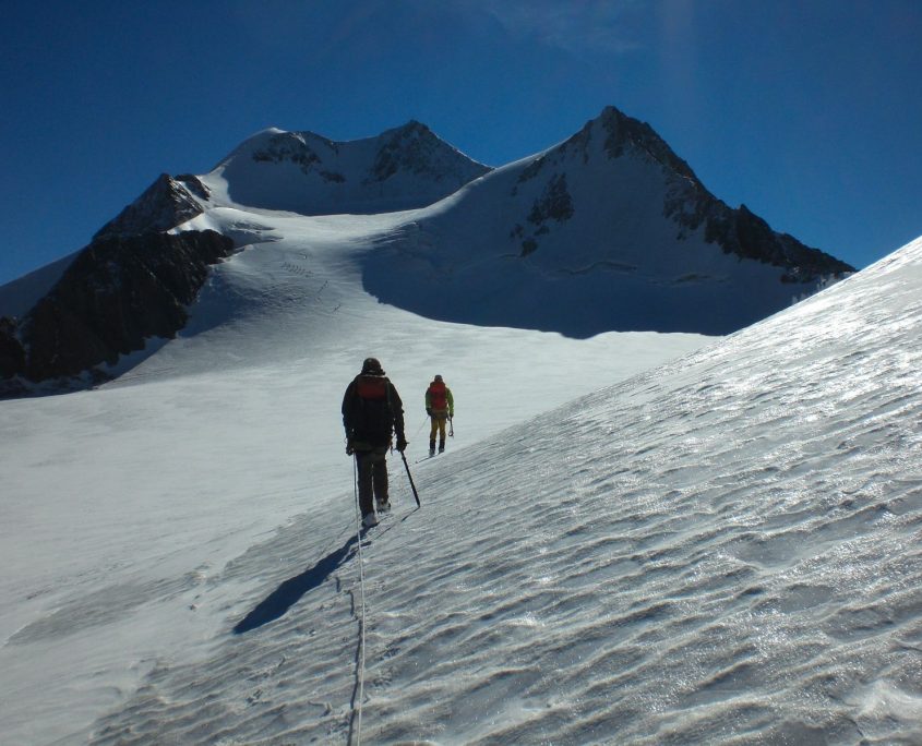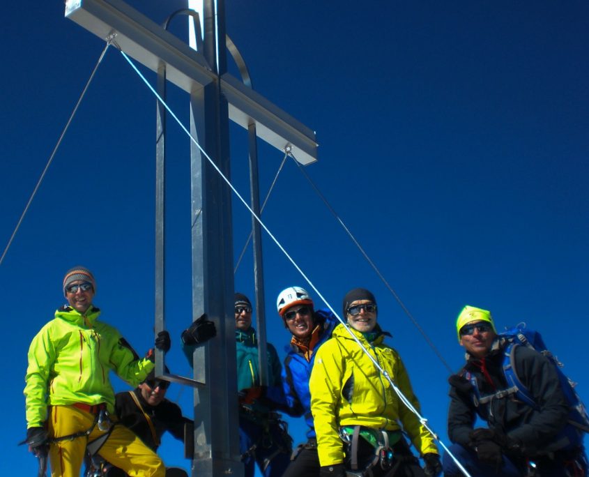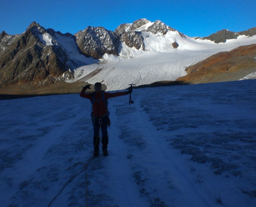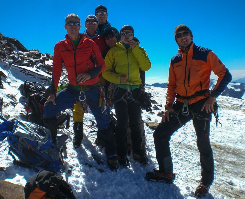 Am Gipfeltag marschierten wir kurz vor Tagesanbruch los. Bald wurde es aber hell und es begrüßte uns ein perfekter Bergsteigertag, wie er eigentlich besser nicht sein kann. Am Vernagtgletscher angekommen übernahm Harald Winter die Führung der Seilschaft. Unter fachkundiger Anleitung von Gerhard brachte er uns sicher über eine Hand voll Spalten und eine steile Rinne hoch zum Brochkogeljoch (ca. 3.400 m). Von dort waren es noch ca. 2 Stunden über den Taschachferner zur Wildspitze (3.770 m), dem höchsten Berg Nordtirols.