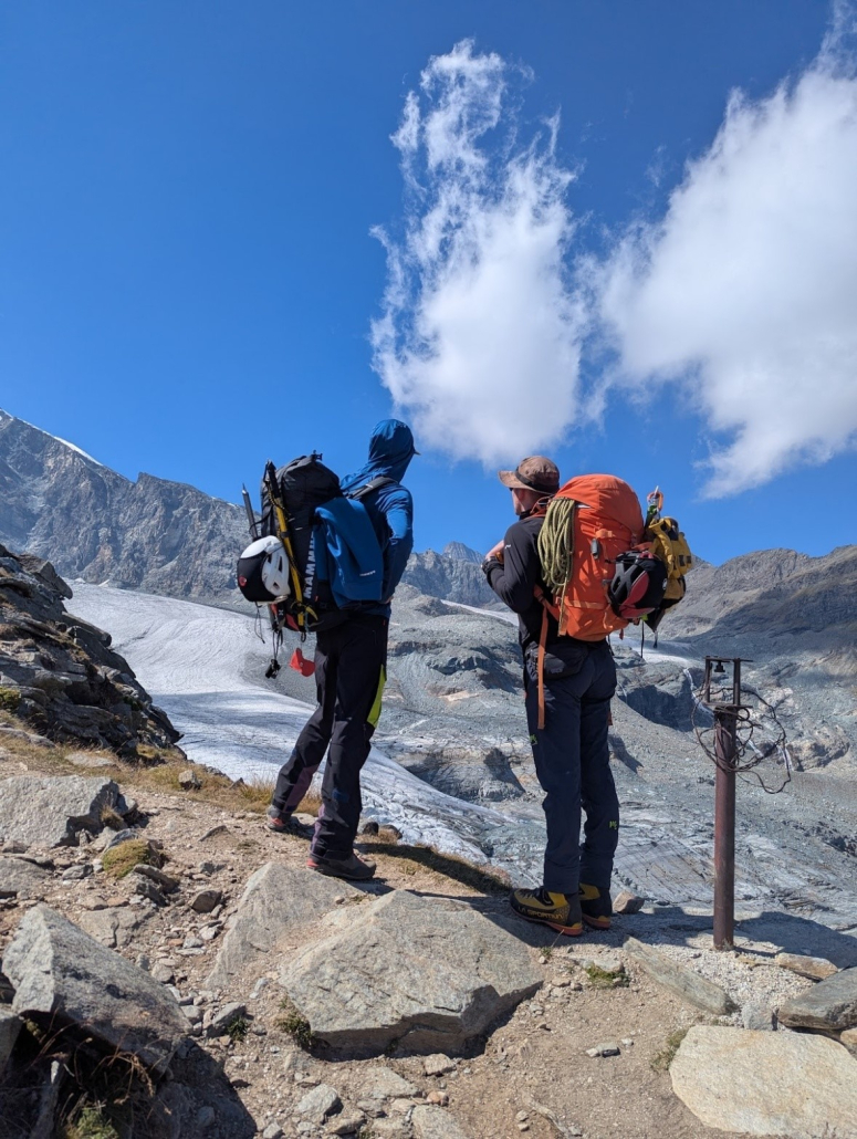 Das Wetter war ein Traum, die Sonne hat gestrahlt und es war trotzdem nicht zu warm. Also starteten wir auf dem Weg zur Hütte und Costina und Stephan haben über deren bisherige Woche im Wallis berichtet, danach waren wir intensiv im Austausch zum Thema perfekter Tourenrucksack, und bevor wir es merkten waren wir bereits beim Gletscher. Anseilen mussten wir uns auf dem aperen Gletscher nicht. Als wir diesen überquerten zeigte uns Philipp worauf man beim Queren des Gletschers achten sollte und wie man am besten treten kann um unnötige Gefahren zu vermeiden. Wir haben sogar einen Gletschertisch gesehen! Zwischendurch hat Philipp auf die Route für den nächsten Tag geachtet und Steinmännchen sowie einen Pfeil aus Steinen gelegt, damit wir früh im Dunkeln leicht den Weg finden können.