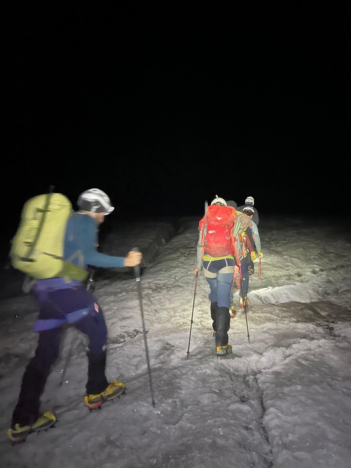 Früh im Dunkeln war es zappenduster, dennoch führte uns Phillip schnell und geschmeidig durch das Spaltengelände, nachdem alle nach dem kurzen Abstieg von der Hütte am Beginn des Gletschers ihre Steigeisen angezogen hatten, welche sie die nächsten sieben Stunden anbehalten sollten.