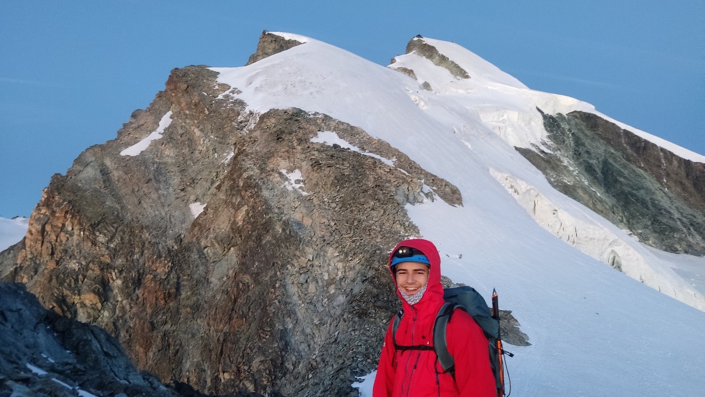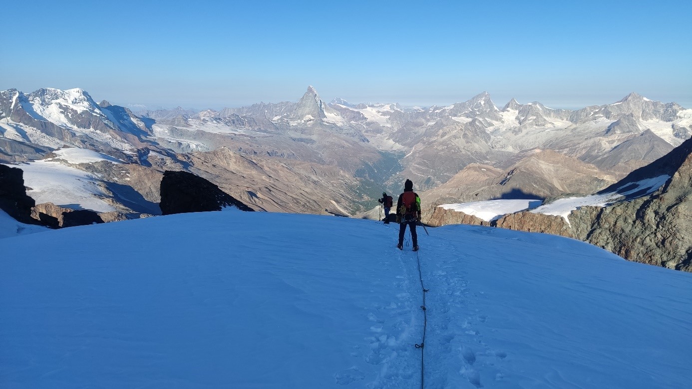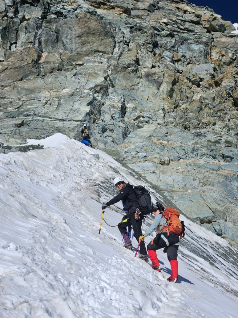 Also machten wir weiter, kamen am Gletscher an, seilten uns an und trafen Philipp wieder vor dem steileren Abschnitt des Firngrats kurz vor der Kletterstelle, die Bergsteiger zur Belustigung den Hillary Step nennen, weil es dort manchmal zu Stau kommt. Gut gesichert gingen wir alle problemlos darüber und über den Firngrat und waren bald auf dem Gipfel des Allalinhorns. Für Lina war das der erste Viertausender! Berg Heil! Alle waren froh, es geschafft zu haben, aber es lag noch ein langer Weg vor uns. Marvin, Lukas und Stephan gingen als erste Seilschaft im Abstieg, Philipp, Costina, Lina und Lukas als Zweite. In Absprache mit der Gruppe hat Costina sich dazu entschlossen, von der Bergstation Mittelallalin ins Tal abzusteigen, und nicht wie geplant zur Hütte zurückzukehren. Sie war erschöpft und konnte sich eine weitere Tour am nächsten Tag nicht mehr vorstellen.