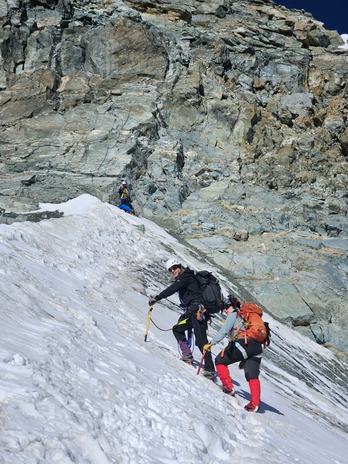Als wir zusammen abstiegen, haben wir eine kurze Pause gemacht. Linas Eispickel hat die Chance benutzt, sich vor uns zu verabschieden und sich auf einer Entdeckungsreise aufm Gletscher gemacht. Einfangen konnten wir Ihn nicht rechtzeitig und die Gruppe hat sich dagegen entschieden, eine Rettungsmaßname für das Gerät zu starten. Lina selbst wollte nicht, dass sich jemand in Gefahr begibt, um den Pickel zu retten. Da Costina sowieso aussteigen wollte, bekam dann Lina später am Lift Ihren Eispickel ausgeliehen. Dort haben wir uns herzlich verabschiedet und die Gruppe setzte die Tour fort bis zur Britanniahütte. An dem Tag hatte jeder, der am Abendessen zusammensaß, über 1700 hm im Auf- und Abstieg bewältigt.