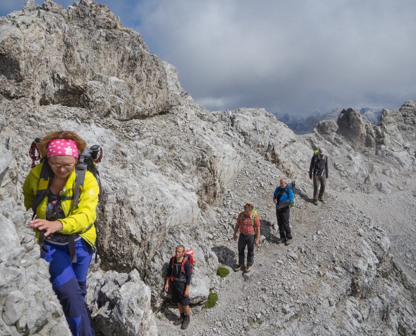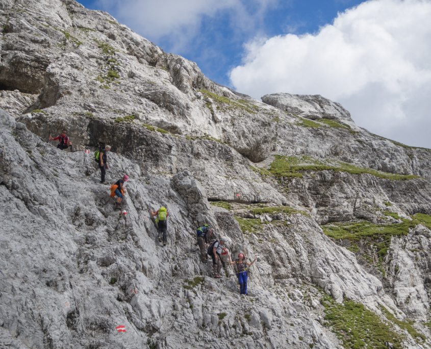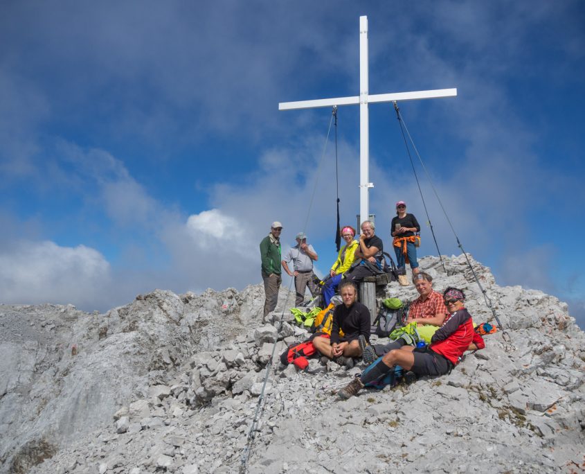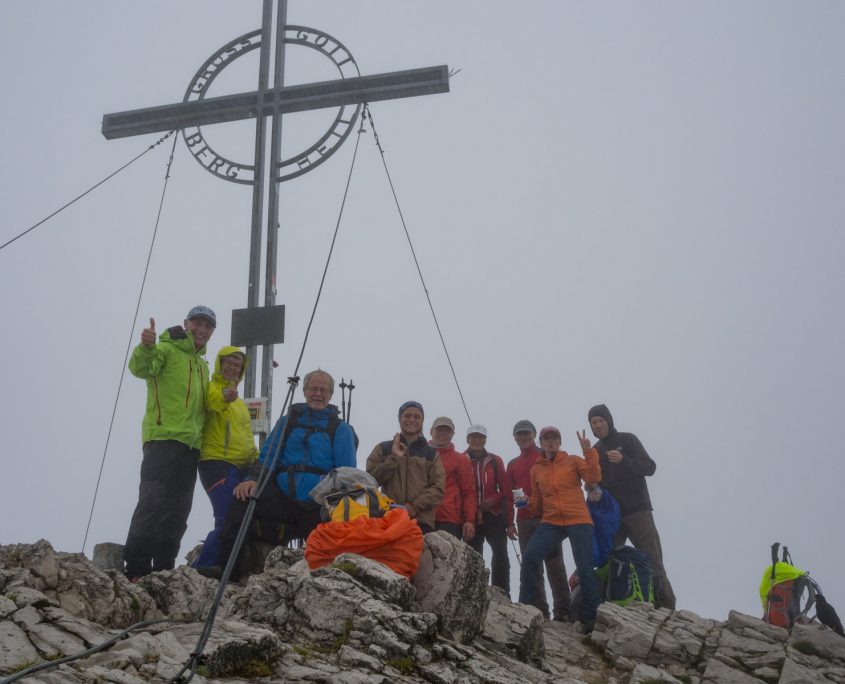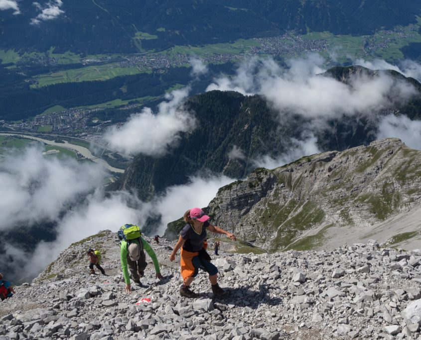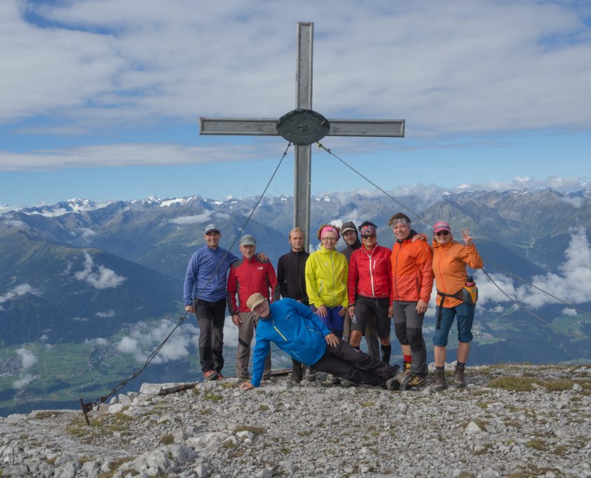 Heute wird endlich das Wetter besser. Stück für Stück lösen sich die Nebelwolken auf. Ein steiler Anstieg ohne Schwierigkeiten führt uns zum großen Solstein (2451 m). Nun haben wir schon einen schönen Blick auf die Österreichische Bergwelt mit dem Zuckerhütl. Nach einer kleinen Fotopause geht’s weiter zur kleinen Solsteinspitze auf 2.637m. Nach kurzem Anstieg über eine schöne Wiese ging es dann auf einem herrlichen anspruchsvollen Aufstieg zum kleinen Solstein, mit seilversicherten Abschnitten. Da wir ein bisschen in Zeitnot sind gehen wir den sehr schottrigen Abstieg durchs Wörglkar, der zum Glück später in einen angenehmen Waldpfad übergeht zur Neuen Magdeburger Hütte (1.633 m). Dort gönnen wir uns eine „Trinkpause“. Unser Rückweg verläuft über den Zirler Schützensteig zurück zum Solsteinhaus. Hier klettern wir eine seilversicherte Rinne von ca. 100 m hoch, die uns allen großen Spass gemacht hat. Danach geht es auf schmalen Pfaden zu unserer Hütte weiter, die wir gegen 17.00 Uhr erreichen.