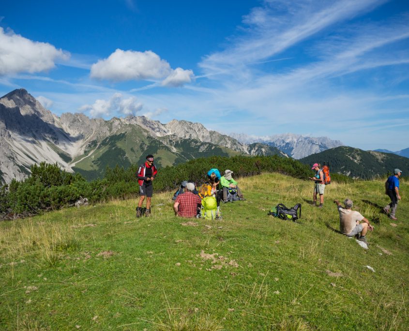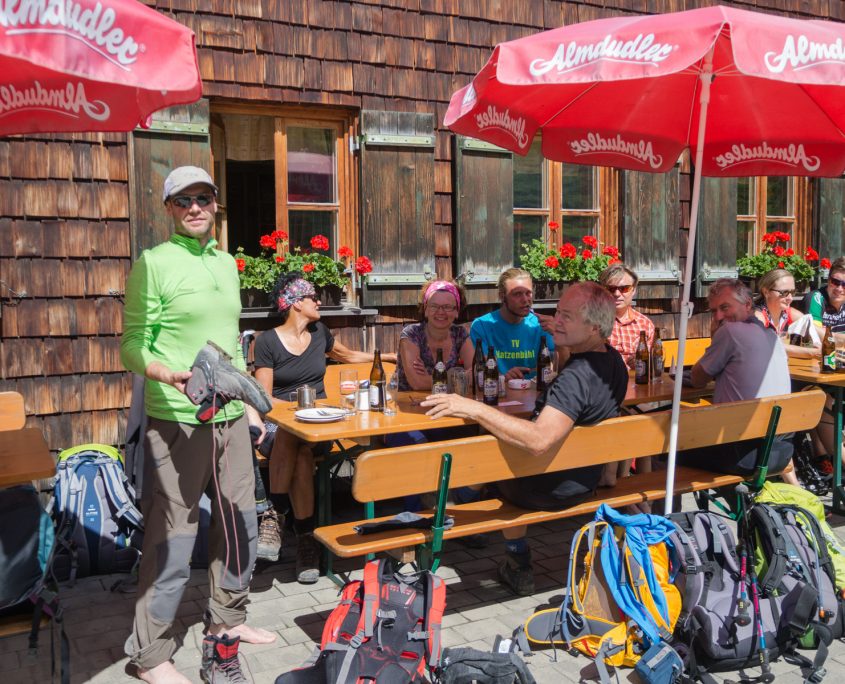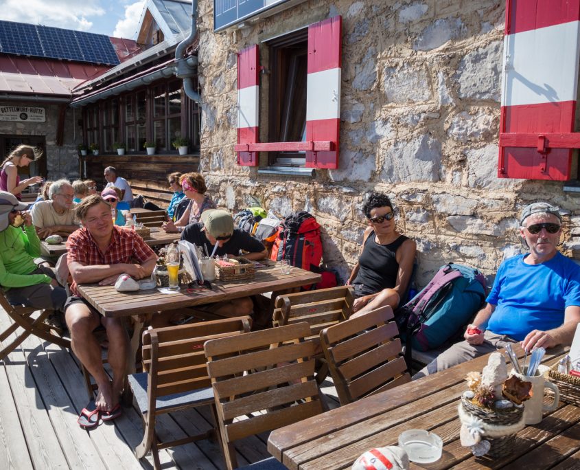 Danach wandern wir alle gemeinsam zur Bettelwurfhütte, die wir am Nachmittag erreichen. So können wir noch ein bisschen auf der Terrasse bei angenehmen Temperaturen und Sonnenschein entspannen. Für den letzten Abstiegstag wurde bereits wieder Regen und Nebel vorausgesagt. Die Strecke zurück nach Absam ist wegen drohendem Felsrutsch gesperrt und wir müssen uns einen anderen Rückweg überlegen.