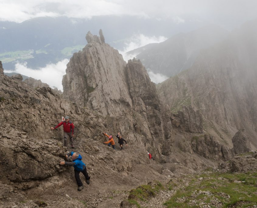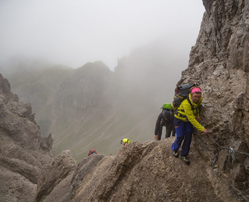 Auch am 2. Tag steht uns weiterhin der Nebel im Weg. Wir beginnen die Tour erst um 9.15 Uhr, nehmen dafür den sehr anspruchsvollen und sehr abwechslungsreichen Freihunger Höhenweg vor. Zu sehen ist praktisch nichts. Aber es ist trocken. Teilversicherter Steig, schwierig aber wir sind sehr motiviert. Der „Nebel des Grauens“ kann uns nichts anhaben. Nach und nach wird es tatsächlich heller und wir besteigen dann noch die Kuhljochspitze (2293 m). Oben angekommen hat uns der Nebel und Regen leider wieder voll im Griff und wir sehen leider nichts von der schönen weiten Bergwelt. Der weitere Wegverlauf (Geröllfeld) zum Solsteinhaus (1805 m) war wieder regenfrei.