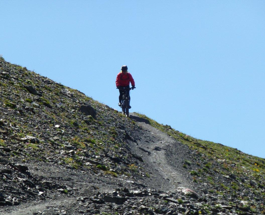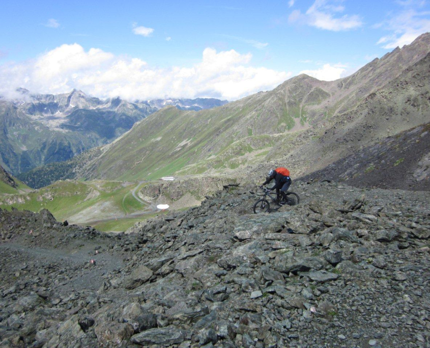 Etwas „Frische“ war für den weiteren Weg vom Idjoch absolut notwendig. Wir wählten den in der Bikerszene recht bekannten „Vellil-Trail“, einen etwa 10 km langen Pfad, der von dort oben 1500 hm bergab zurück nach Ischgl führt. Landschaftlich ein absoluter Traum, stellte der Trail zumindest in den unteren Abschnitten gehobene Ansprüche an die Fahrtechnik. „Wer sein Rad liebt, der schiebt“ – dies haben wir auf dieser Abfahrt schließlich alle länger oder kürzer gemacht.