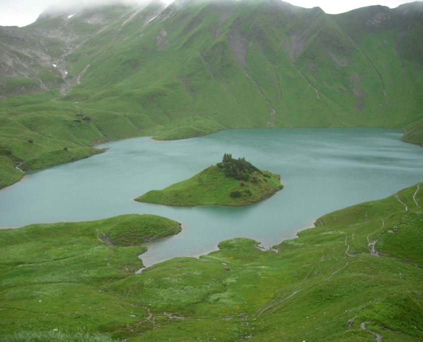 Der Weg ist traumhaft und trotz des Regens, der uns nahezu ohne Unterbrechung begleitet, bieten sich uns wirklich sehr schöne Ausblicke. Mein persönliches Highlight ist der Schrecksee. Durch dessen baumbewachsene kleinen Insel und die Lage, eingebettet in die Berge, umgebend von saftigem Grün, glaubt man fast, man befinde sich in Schottland und die Bäume seien ein Castle. Perfektioniert wird diese Vorstellung durch den Regen – typisch schottisch eben…