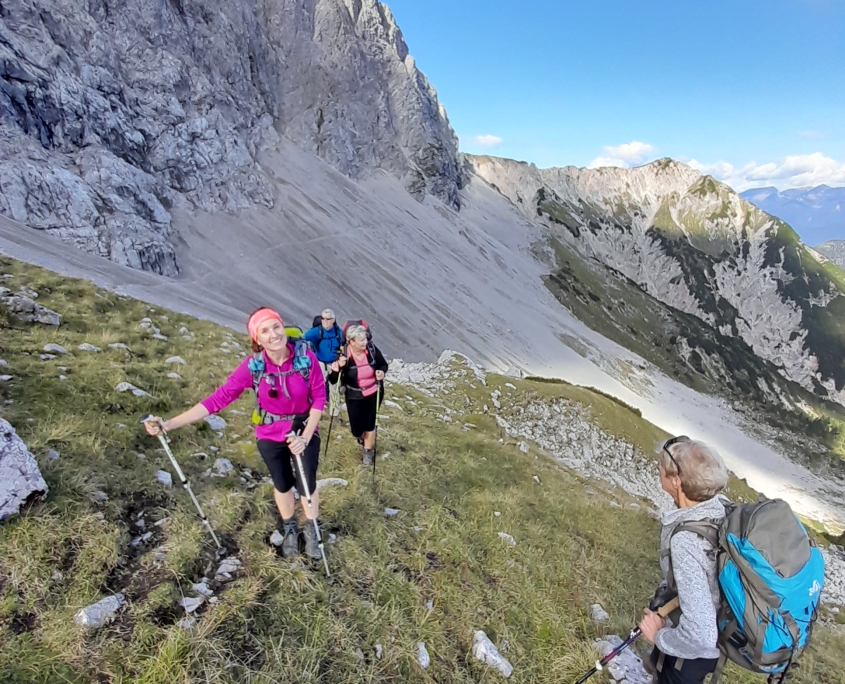 Tags darauf stand die Königsetappe mit der Querung ins Karwendeltal an. Hierzu geht es zunächst 300 m bergauf zum Wörnersattel. Danach folgen lange Querungen durch Schottergelände, was allen Teilnehmern ein hohes Maß an Konzentration abverlangte. Als Krönung folgt der Gjaidsteig, eine seilversicherte stark ausgesetzte Felspassage mit der Überquerung der Grenze nach Österreich. Auf der Passhöhe stellte sich das Gefühl ein, wir hätten unser Tagewerk nahezu verrichtet. In der Ferne grüßte bereits das Karwendelhaus, der Pfad schlängelte sich bei so ca. 1.700 m Höhe am Berg entlang. Aber Wurzeln, Felsen sowie Ab- und Aufstiege forderten dann doch unsere letzte Kondition, so dass wir das Bier und die Dusche im Karwendelhaus umso mehr genossen!