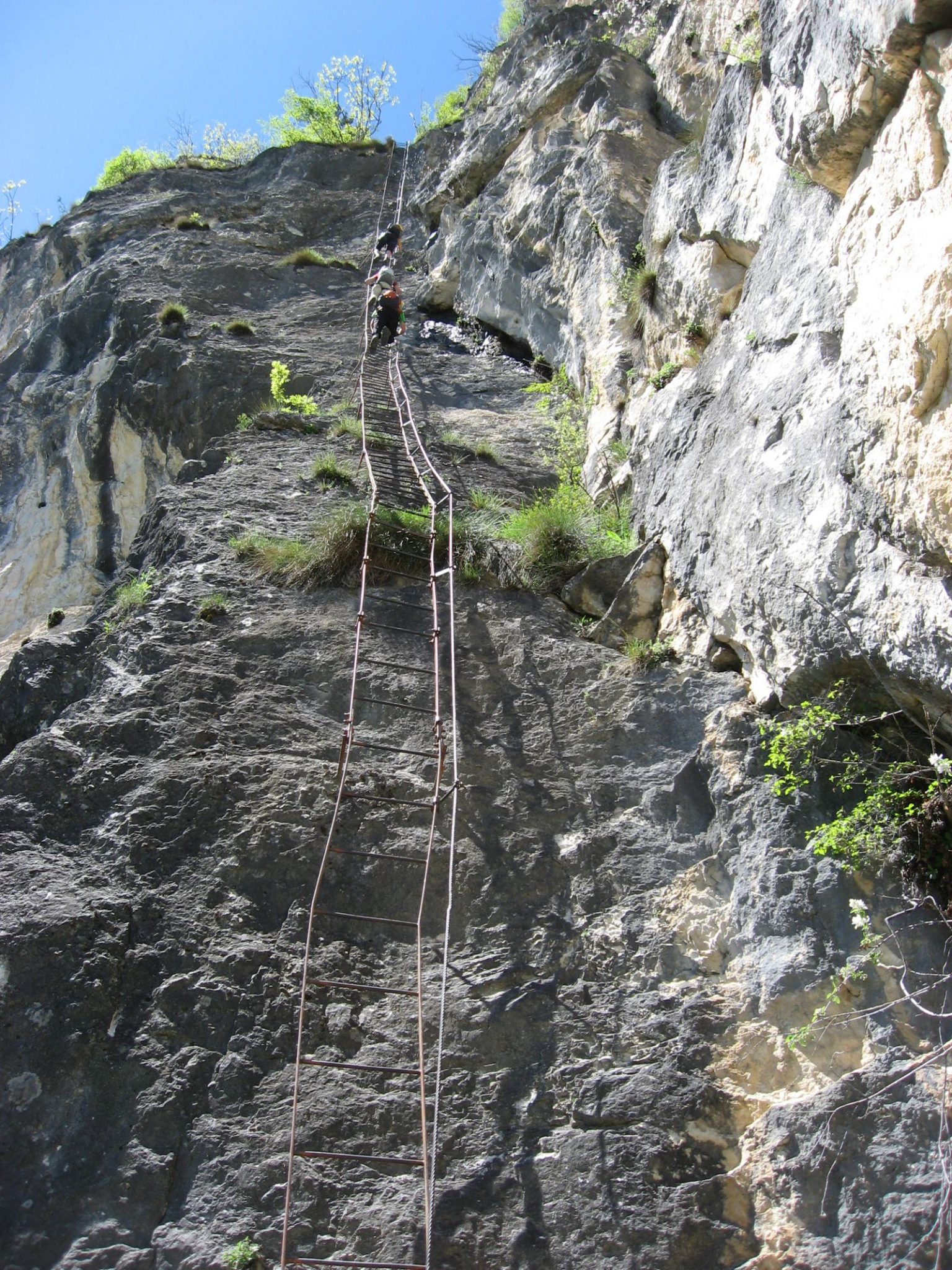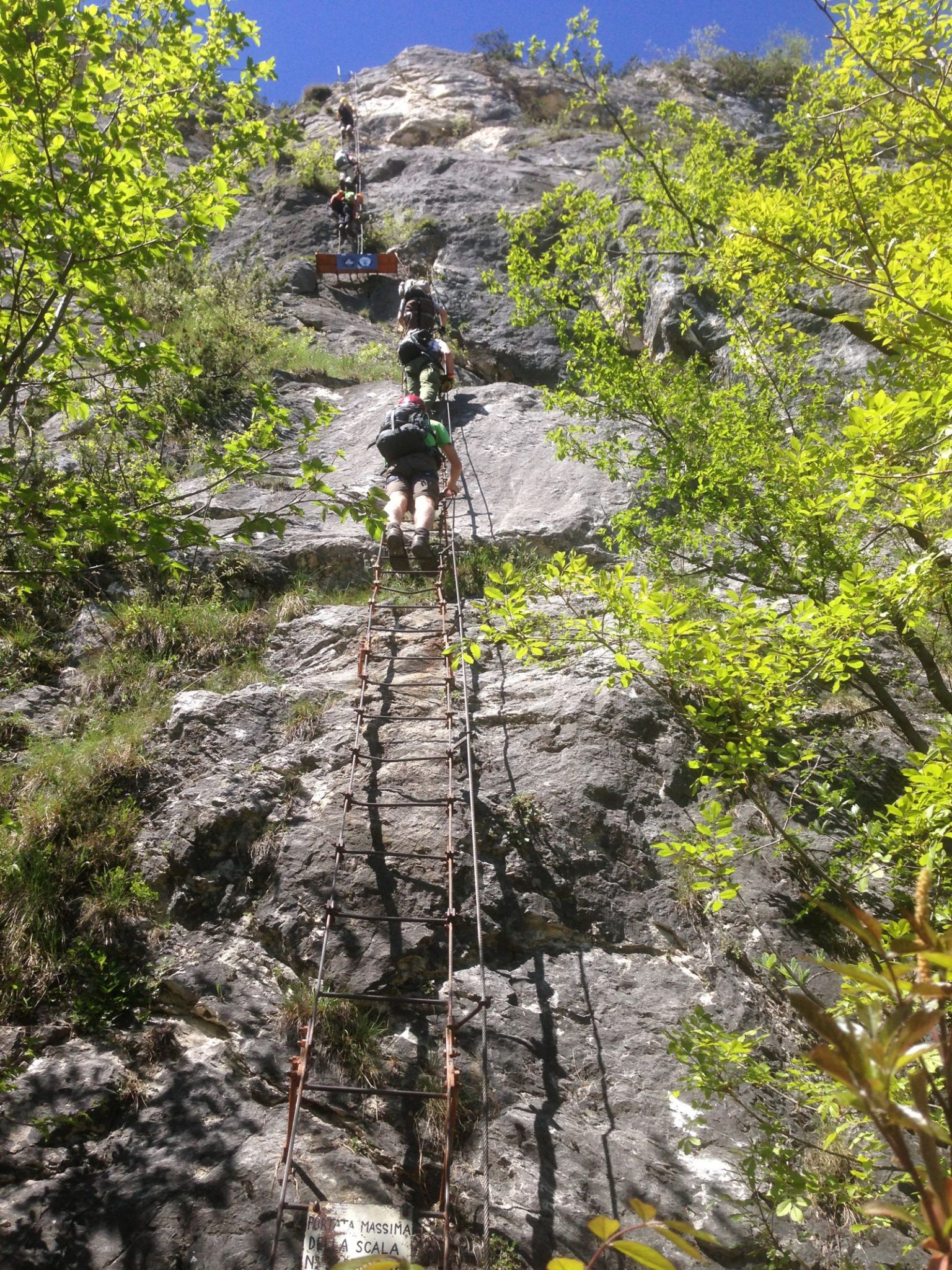 Am nächsten Morgen soll es losgehen am Fia Ferratta Amicizia. Der Klettersteig ist bekannt durch seine direkte Lage über Riva del Garda und Leitern mit 40 und 70 m Länge. Tatsächlich sind die Leitern aus der Ferne in Form eines braunen vertikalen Strichs an der Felswand zu erkennen. Der Aufstieg führt an einem Refugio und der Kapelle Santa Barbara vorbei bis zum Einstieg. Über ein Zwischenpodest sind die Leitern verbunden welche an der Felswand senkrecht nach oben führen. Weiter geht`s über den Steig auf 1246m zum Cima Sat, der erste Klettersteig ist geschafft die Truppe ist happy.