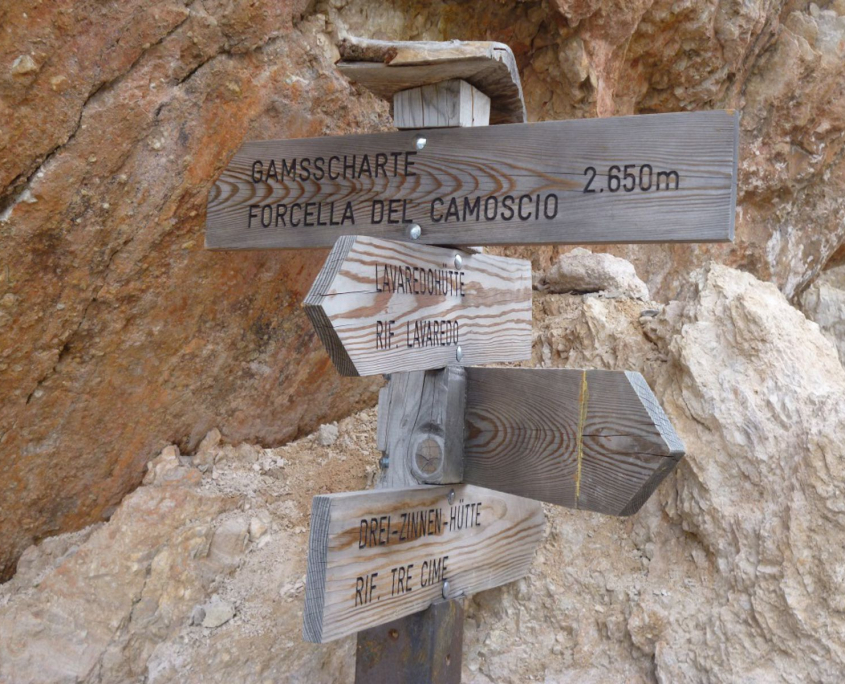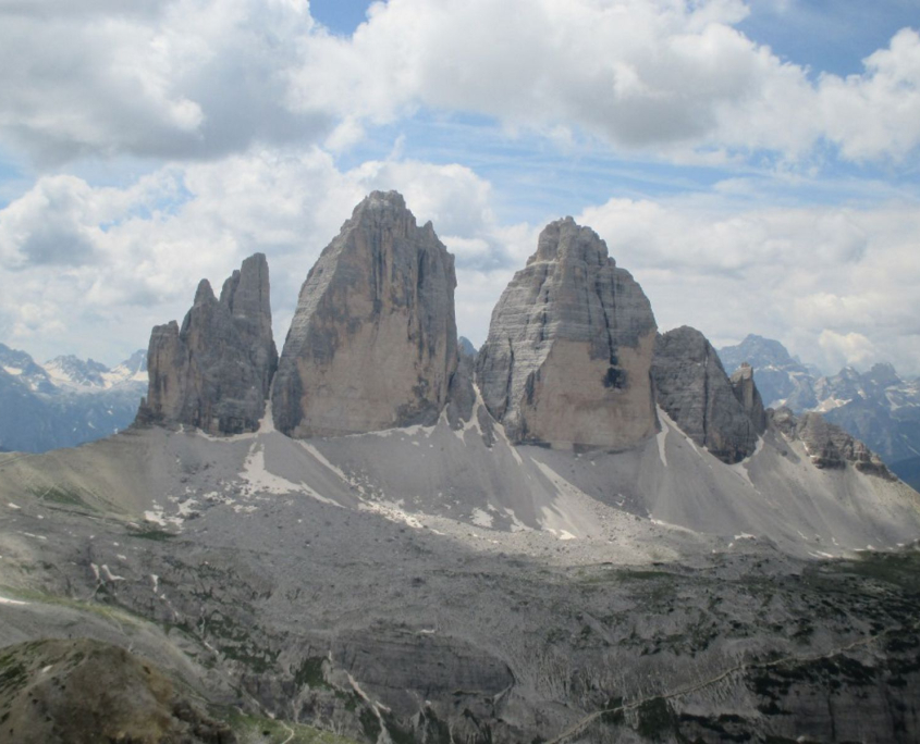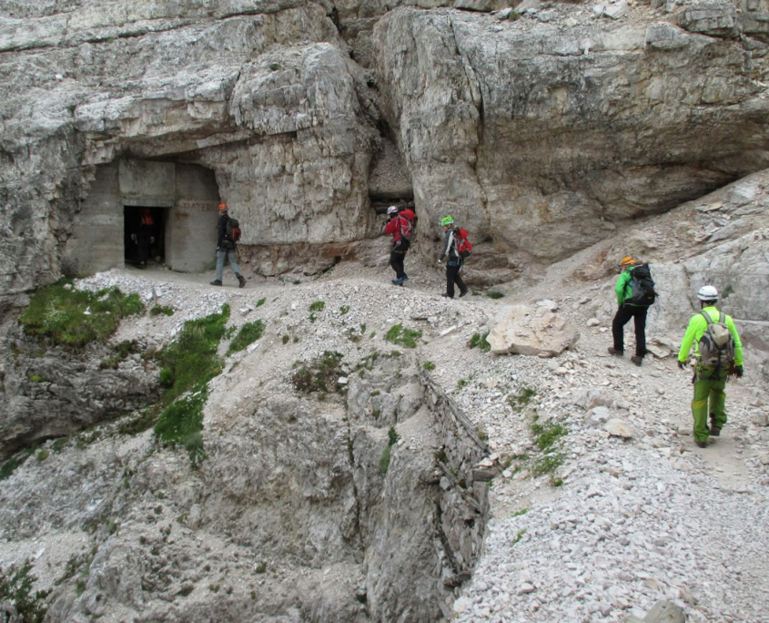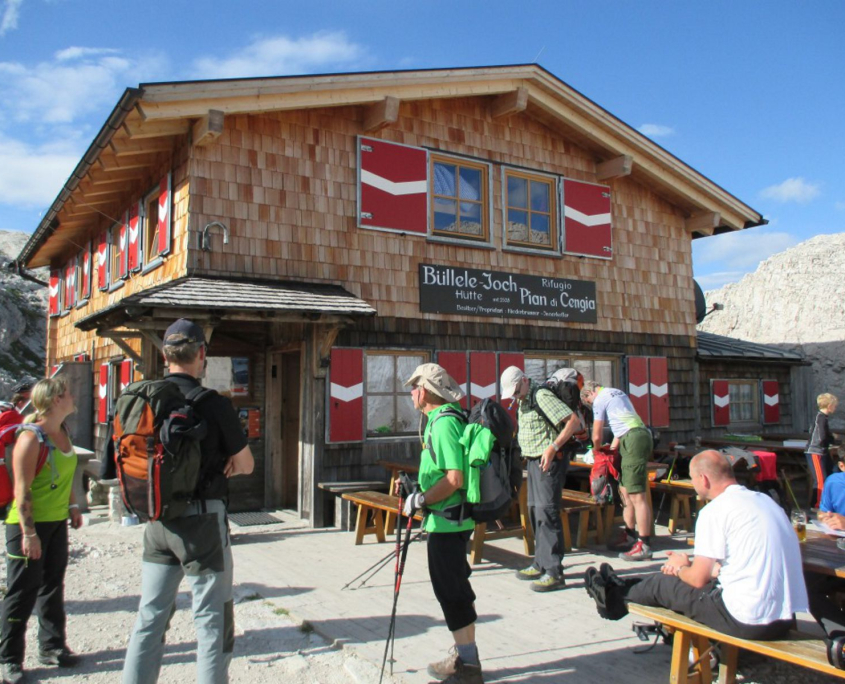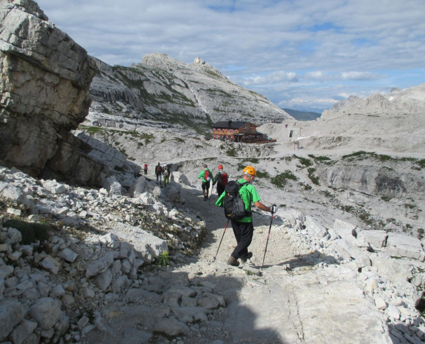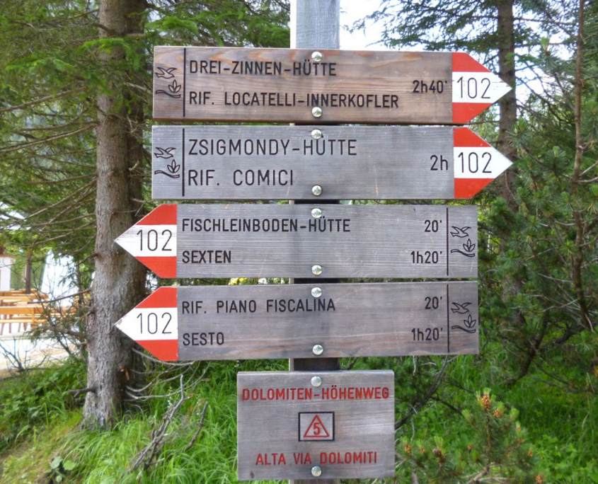 20.07.2014: Nach einem frühen Treffen am Bahnhof in Insheim und stauloser Fahrt über Ulm, Fernpass und Brenner erreichen unsere 8er-Mannschaft (Andrea, Andreas, Franzi, Franz, Kurt, Peter, Richard und Wolfgang) kurz nach Mittag Sexten. Leider können wir unsere zwei Ferienwohnungen nicht direkt beziehen, so dass wir sofort zu unserer ersten Tour starten. Vom Parkplatz beim Hotel Drei Zinnenblick im Höhlental (Valle Landro) steigen wir zum Einstieg des Hauptmann-Bilgeri-Gedächtnissteig. Über diesen kurzen Klettersteig (Schwierigkeit B/C) erreichen wir nach fast 1000 Hm den Gipfel des Monte Piano (2305 m). Nach kurzer Rast mit erstem Blick auf die Drei Zinnen steigen wir über den Touristensteig, vorbei an Stellungen des ersten Weltkriegs wieder ins Tal ab und wandern am Dürrensee entlang bis zurück zum Ausgangspunkt.