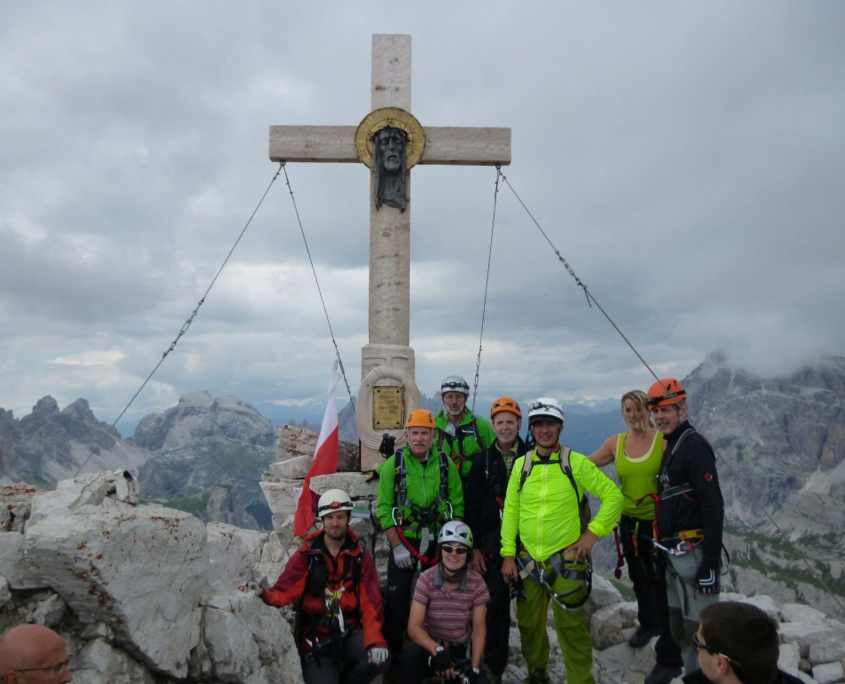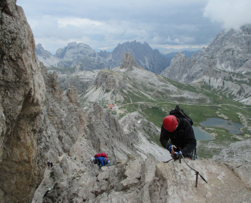23.07.2014: Dieser Tag ist dank des guten Wetters für die Königsetappe dieser Ausfahrt reserviert. Vom Parkplatz bei der Fischleinbodenhütte (1454 m) wandern wir an der Talschlusshütte vorbei über einen Teil des „Alta Via delle Dolomiti“ bis zur Dreizinnen-Hütte (2405 m). Ohne große Rast gehen wir weiter zum Einstieg des Leiternsteig auf den Toblinger Knoten, dessen Gipfel (2617 m) wir ohne große Wartezeit erreichen. Nach kurzer, musikalisch umrahmter Gipfelrast beginnt der Abstieg zur Dreizinnen-Hütte, auf der wir aufgrund der Menschenmassen nur eine kurze Rast einlegen. Von dort geht es am Frankfurter Würstel vorbei durch mehrere kurze und einen langen, im ersten Weltkrieg in den Fels gehauene Tunnel zum Einstieg des Klettersteiges (Schwierigkeit B/C). Vorbei an der Gamsscharte geht es zum Gipfel des Paternkofels (2744 m). Nach dem Abstieg zur Gamsscharte geht es von dort über den Schartenweg zur wunderschön gelegenen Büllelejochhütte (2528 m), wo Kaffee und Kuchen uns zur Rast animieren. Vor uns liegt nun noch der Abstieg über die Comici-Hütte (2224 m) bis zurück zum Ausgangspunkt, welchen wir nach insgesamt 12:45 Stunden erreichen. Trotz der schweißtreibenden Aufstiege, der zum Glück nur kurzen Wartezeiten an einigen Steigpassagen und teilweise leichtsinnig ausgerüsteten Klettersteiggehern (profillose Turnschuhe, selbstgebastelte Klettersteigsets ohne Fallbremse, …) war dieser Tag ein echtes Highlight und wird uns durch die atemberaubende Landschaft lange in Erinnerung bleiben.