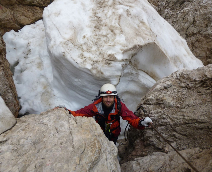 22.07.2014: Der Vormittag verspricht gutes Wetter, so dass wir vom gleichen Ausgangspunkt wie am Vortag den Zustieg zum Via Ferrata Ettore Bovero am Col Rosa (2166 m) angehen. Nach Aufstieg und Anziehen der Ausrüstung nehmen wir den teilweise ausgesetzten Klettersteig zum Gipfel in Angriff (Schwierigkeit C/D). Nach gut griffigem Fels und schönen Tiefblicken erreichen wir den Gipfel, wo schon Richard auf uns wartet. Nach der Gipfelrast mit Gipfelfoto und Mundharmonikamusik (Danke Richard!) geht es wieder zurück ins Tal.