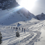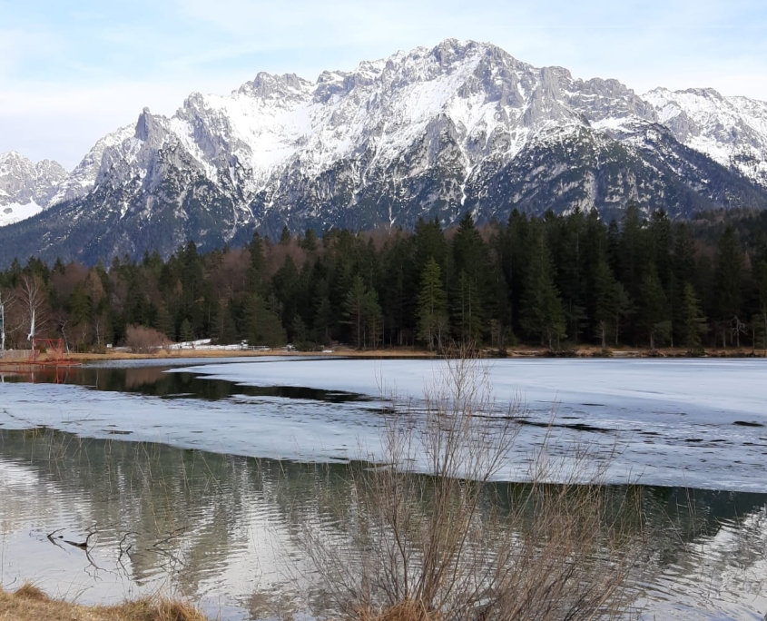 Am zweiten Tag ging´s uns schon besser, wir hatten uns an die Bewegung und die Loipenverhältnisse gewöhnt und waren einige Stunden auf der Loipe. Über Nacht waren die Loipen präpariert worden. Wir starteten mit vereisten Verhältnissen und hörten erst wieder auf, als sich die Loipen in Matsch und Wasser verwandelt hatten. Nach einer gemütlichen Mittagspause wechselten wir unsere Schuhe und wanderten von unserer Unterkunft in Mittenwald zu den Bergseen Lautersee und Ferchensee hinauf. Wir gingen lange Strecken im Wald, sahen die ersten Leberblümchen, eine Kapelle über dem vereisten Lautersee und gelangten bis auf 1060 Meter zum zugefrorenen Ferchensee. Wenn auch der See im Sommer warm sein soll, so war es nun im Februar in der Höhe doch noch ziemlich kalt und wir spazierten bald wieder talwärts.
