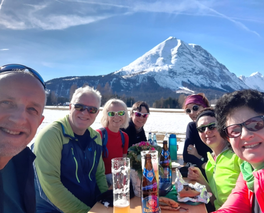 Bei frühlingshaften Witterungsverhältnissen trafen wir uns am Donnerstag Mittag beim Skiverleih in Leutasch. Wir, das sind Ursula, Gabi, Heidi, Petra, Markus, Stefan und ich, waren anfangs beim Anblick der bräunlichen Wiesen mit weiß durchzogenen Langlaufbändern gar nicht recht begeistert. Doch es stellte sich heraus, dass es vom Stadion an gespurte Loipen gab und diese gar nicht so schlecht waren. So nutzten wir die Gelegenheit, um die Langlaufsaison zu eröffnen, die die meisten schon vor Tagen oder Wochen beendet hatten. Wir drehten so lange unsere Runden, bis wir eine neue Art des Langlaufens entdeckt hatten – den „Aqua-Langlauf“. Mit etwas durchnässten Schuhen legten wir vor einer kleinen Hütte am Loipenrand eine Pause ein und genossen den sonnigen Tag.