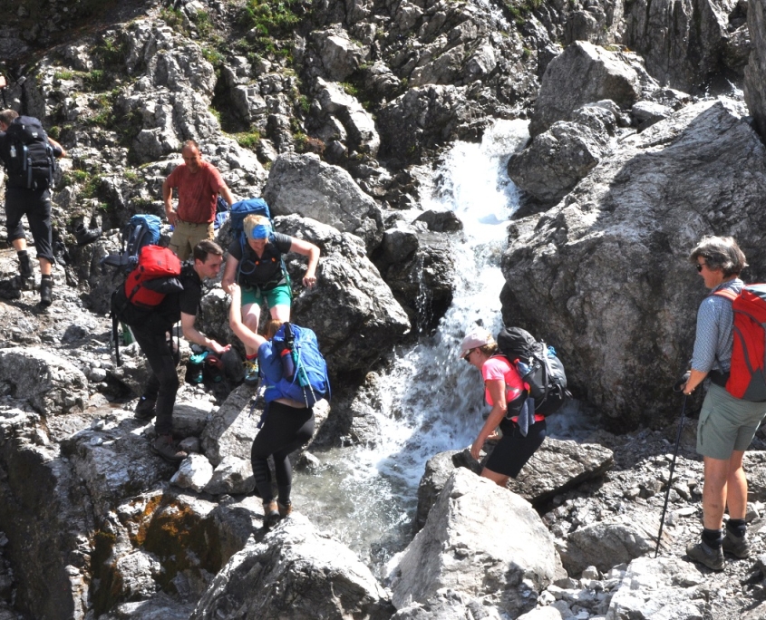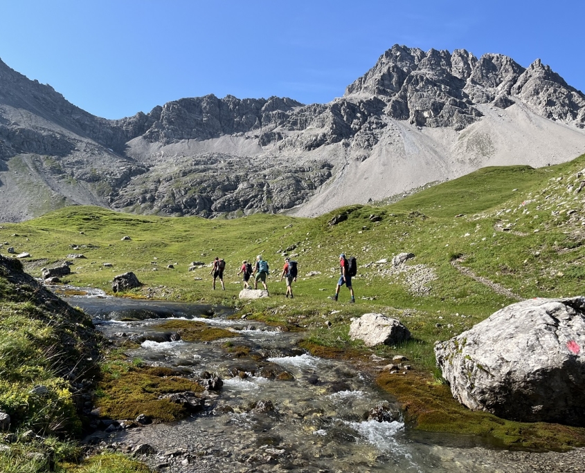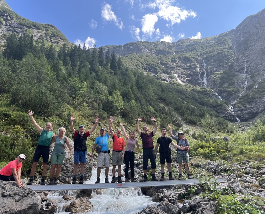 Der teils mühsame Abstieg führte uns weiter über das Alblittjoch bis zum Branntweinboden, immer begleitet von beeindruckenden Blicken auf die umliegenden Berge und Wasserfälle, die durch den Regen der letzten Tage entstanden waren. Der letzte gemütliche Abschnitt verlief entlang des Flusses hinunter nach Gramais, unserem Ausgangspunkt. Erschöpft, aber erfüllt von den Erlebnissen der letzten Tage, erreichten wir am späten Nachmittag das Dorf. Zurück am Auto ließen wir die Tour Revue passieren und tauschten uns darüber aus, was wir voneinander gelernt hatten.