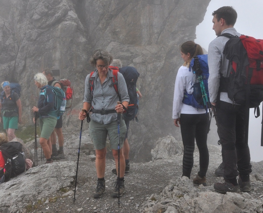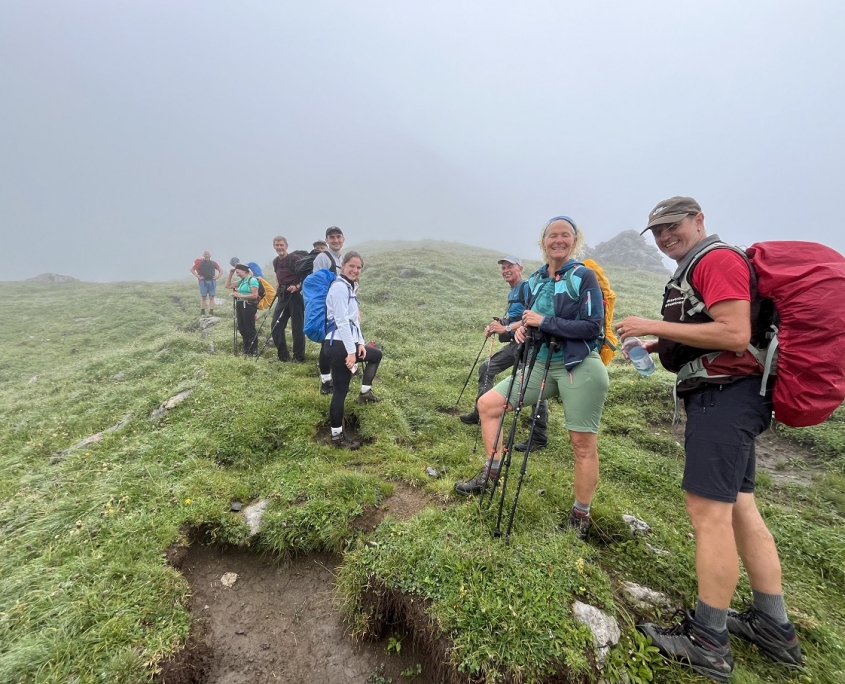 Gestärkt machten wir uns auf den weiteren Weg zur Kogelseescharte auf 2.497 Metern. Der Pfad wurde zunehmend steiler und felsiger, während dichter Nebel aufzog und uns die Sicht nahm. Nach insgesamt etwa 1.200 Höhenmetern erreichten wir die Scharte und begannen mit dem Abstieg zur Hanauer Hütte auf 1.922 Metern, wobei wir unsere ersten Bergziegen und Murmeltiere entdeckten. Auf den letzten Metern setzte der Regen dann doch noch ein, aber wir waren froh, dass wir so lange trocken geblieben waren.