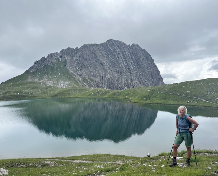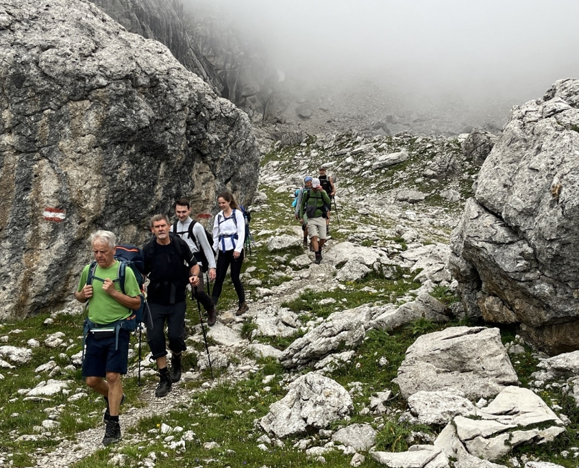 Von der Dremelscharte stiegen wir zum malerischen Steinsee hinab, an dessen Ufer Pferde friedlich grasten und der bei besserem Wetter sicherlich zum Baden eingeladen hätte. Anschließend machten wir uns auf den letzten Abschnitt des Tages zur Steinseehütte auf 2.061 Metern und erreichten diese am frühen Nachmittag – bereit, uns bei Schoki und Apfelstrudel aufzuwärmen. Während unsere Schuhe mehr oder weniger trockneten, übten wir uns erneut in Gesellschaftsspielen und stellten fest, dass drei mal fünf manchmal sogar 500 ergeben kann.