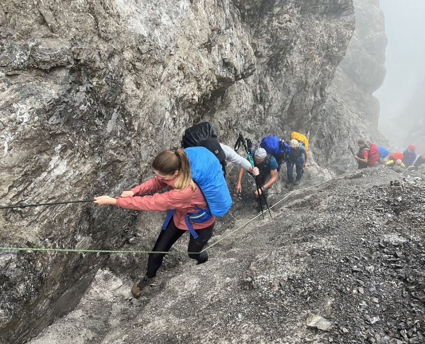 Der zweite Tag versprach eine etwas kürzere Etappe, weshalb wir das gemütliche Frühstück auf der Hanauer Hütte ausgiebig genossen, bevor wir uns entspannt auf den Weg zur östlichen Dremelscharte (2.470 m) machten. Der Anstieg gestaltete sich zwar anstrengend, doch nach etwa zwei Stunden und rund 650 Höhenmetern erreichten wir die seilversicherte Scharte. Unterwegs lernten wir wichtige Sicherheitsvorkehrungen und wie man sich vor Steinschlag schützt.