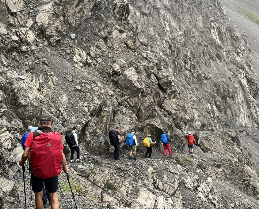 Der dritte Tag markierte die längste und anspruchsvollste Etappe unserer Tour. In teils noch feuchten Schuhen machten wir uns von der Steinseehütte auf den Weg zum ersten von mehreren Pässen, dem Gufelgrasjoch (2.382 m). Unterwegs konnten wir erneut zahlreiche Murmeltiere sowie eine große Herde Steinböcke und mehrere Pferdeherden beobachten, die uns für die Anstrengungen des Aufstiegs belohnten.