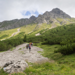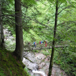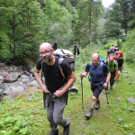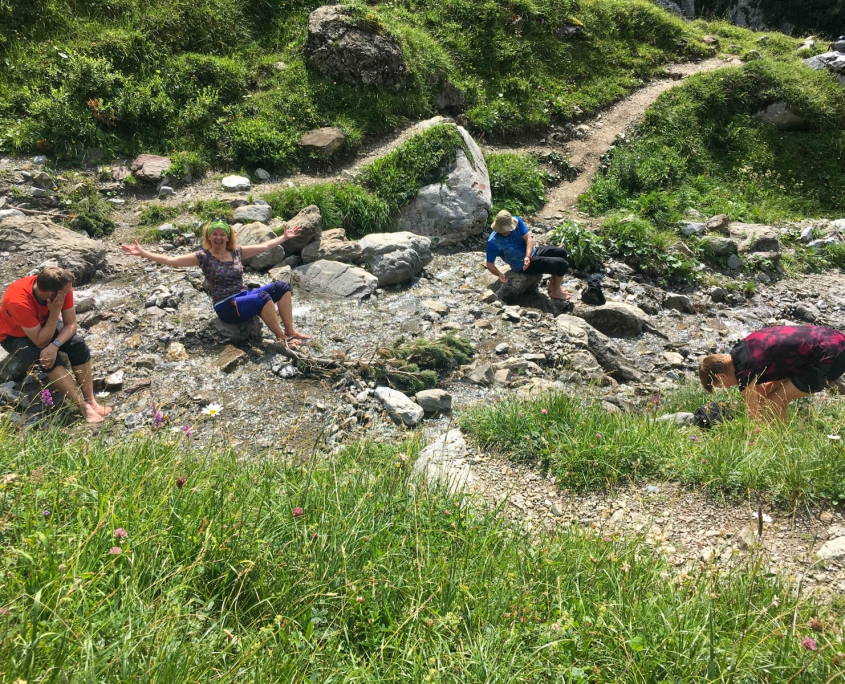 Nach der Querung der Schwarzen Scharte wandern wir nun ca. 2 Stunden auf einem technisch anspruchsvollen und konditionsfordernden Weg hinab ins Tal, der Weitblick in die herrliche Berglandschaft und nach unten ins Tal entschädigt uns jedoch großzügig für unsere Strapazen. Am Talfuß angekommen, treffen wir auf einen Bergbach, den einige von uns zur erfrischenden Abkühlung nutzen. Jetzt ist es nicht mehr weit bis zur Lindauer Hütte. Angetrieben durch die wohl positive Motivation legen Inge und Hans-Werner einen ganz schönen Zahn zu. Das können Harald und ich natürlich nicht auf uns sitzen lassen, und so liefern wir uns auf dem letzten Teilstück durch den Wald einen kleinen Wettlauf bis hin zur Hütte.