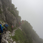 Zu unseren Rucksäcken zurückgekehrt, machen wir uns weiter auf den Weg durchs Schweizertörlie, vorbei an einer alten Zollhütte, entlang an mächtigen Felswänden. Beim Abstieg kommen uns ein paar Mountainbiker entgegen, die ihr Bike tatsächlich einige Höhenmeter den Berg hochtragen, Respekt. Auch die beiden Kletterer die gerade in eine 9er Tour einsteigen sind nicht zu verachten.
