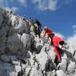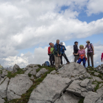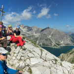 Kurz vor dem Schweizertörlie, deponieren wir unsere Rucksäcke am Joch um die Kirchlispitzen auf 2552 m zu besteigen. Das macht jetzt mal so richtig Spaß und ist der Truppe auch anzumerken, denn das weiße Kalkgestein im Kontrast zum stahlblauen Himmel und dem Gleitschirmflieger über unseren Köpfen ergibt wohl das richtige Umfeld, um die 1er Kletterei zu einem wahren Genuss zu machen. Auf dem Gipfel angekommen werden wir mit einem noch schöneren Blick über die ganze Berggruppe des Rätikon dessen schroffem Gestein und darin eingebettet der im Sonnenlicht glänzende Lüner See, belohnt.