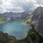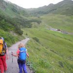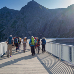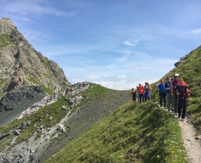 Aufgepackt geht es nun auf einem schönen, langen und schmalem Pfad entlang des Berges mit grandioser Aussicht ins Tal, zu unserem zweiten Etappenziel hin zur, am Lüner See gelegenen, Douglass Hütte der bei unserer Ankunft durch die nun scheinende Sonne in einem wunderschönen Türkisblau leuchtet.